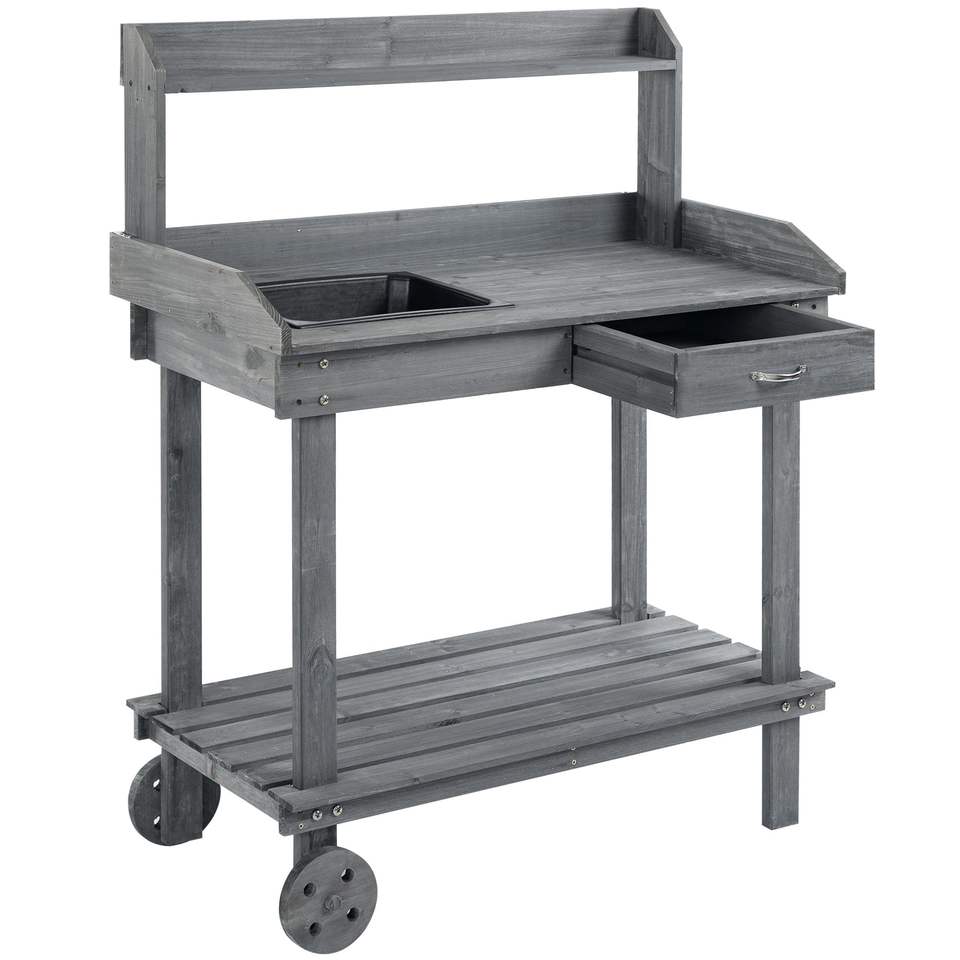 Panca in legno grigio con ruote lavello cassetti spazi di stoccaggio per mobili da giardino