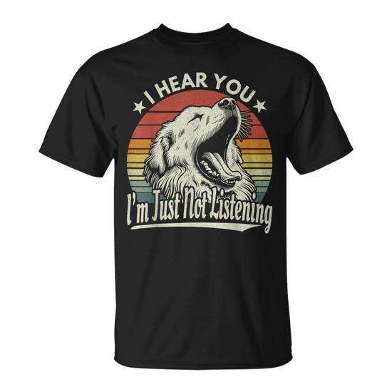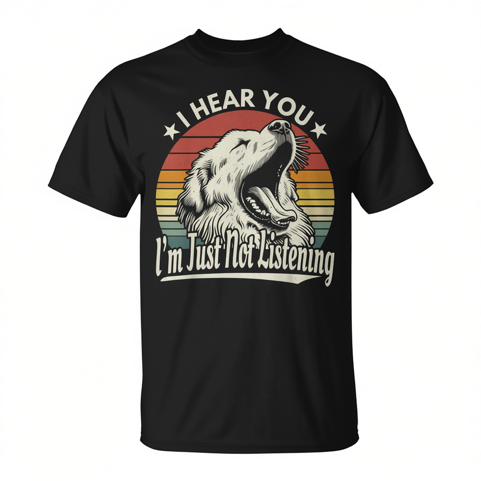 T-shirt con stampa di un cane dei Pirenei che fa il bisicchierio: Ti sento, ma non ascolto. Design vintage, vestibilità unisex.