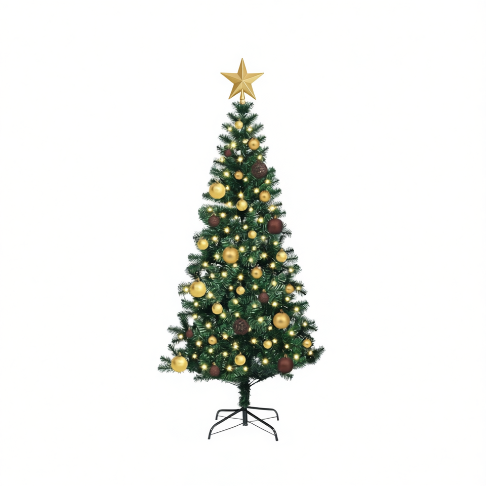 Artificial Pre-Lit Christmas Tree 59.06 In Green PVC Metal Construction Warm White LED Indoor Standing Tree With Ornaments