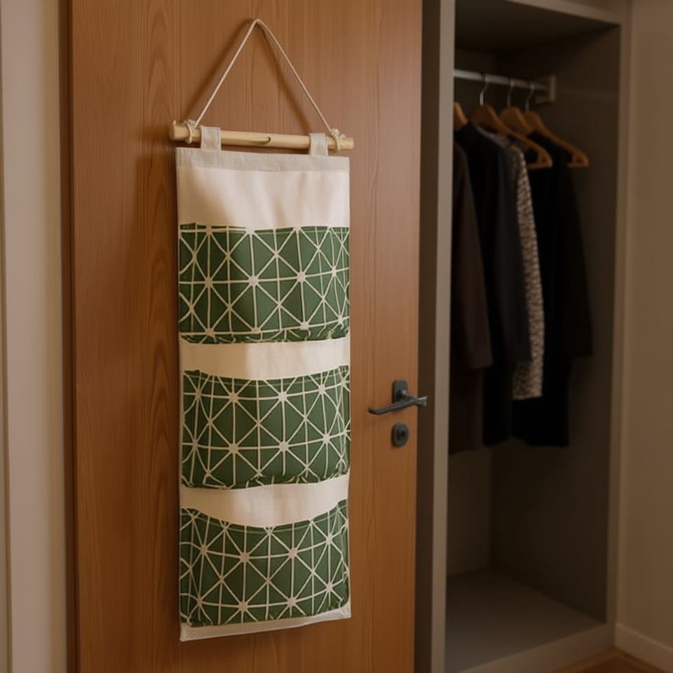 Borsa portaoggetti da appendere alla porta verde, organizer in tessuto a tre strati, soluzione salvaspazio da parete per armadio, design minimalista in cotone
