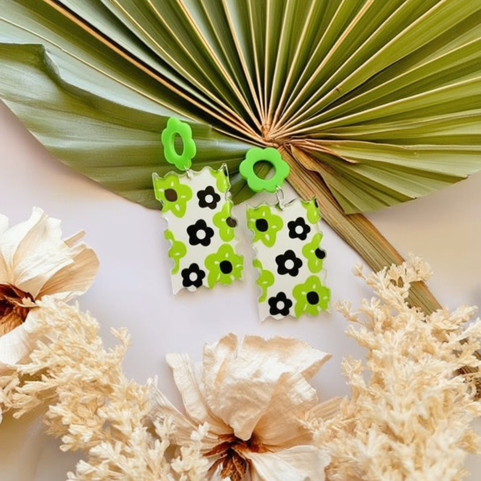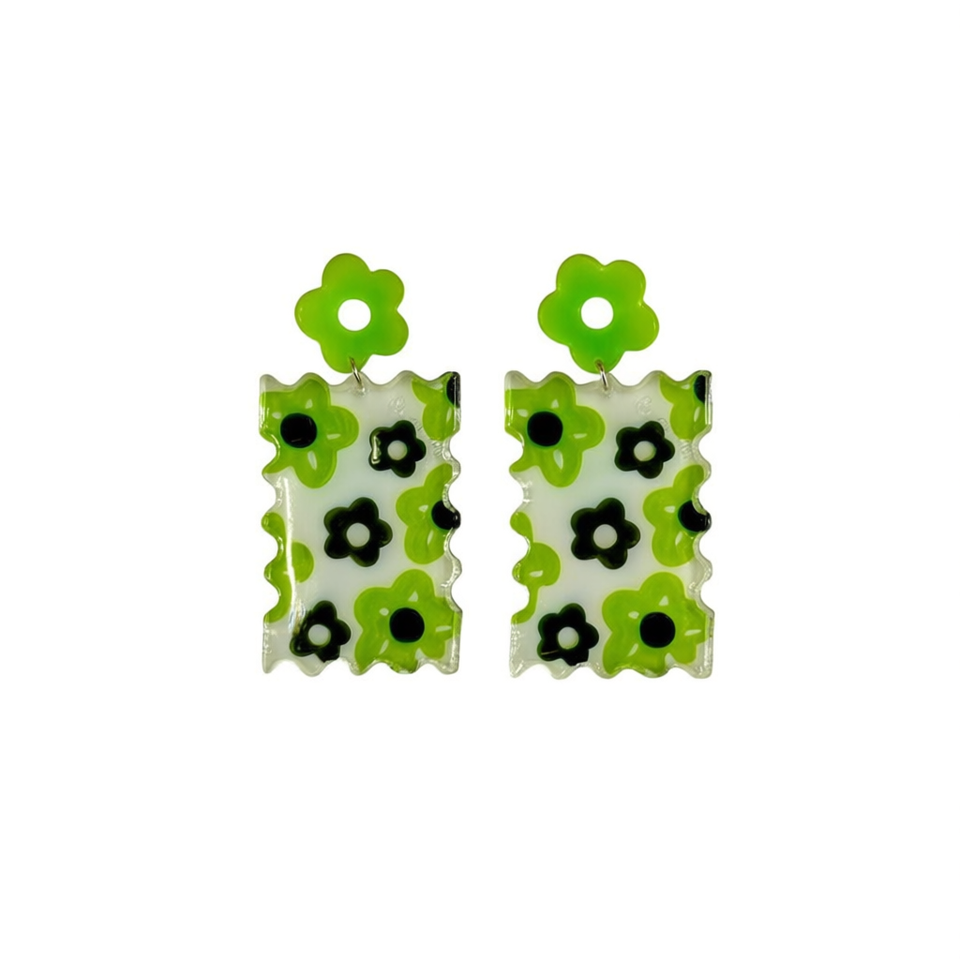 Green Floral Acrylic Earrings Rectangle Shape Digital Printing Fashion Trend Women Accessories