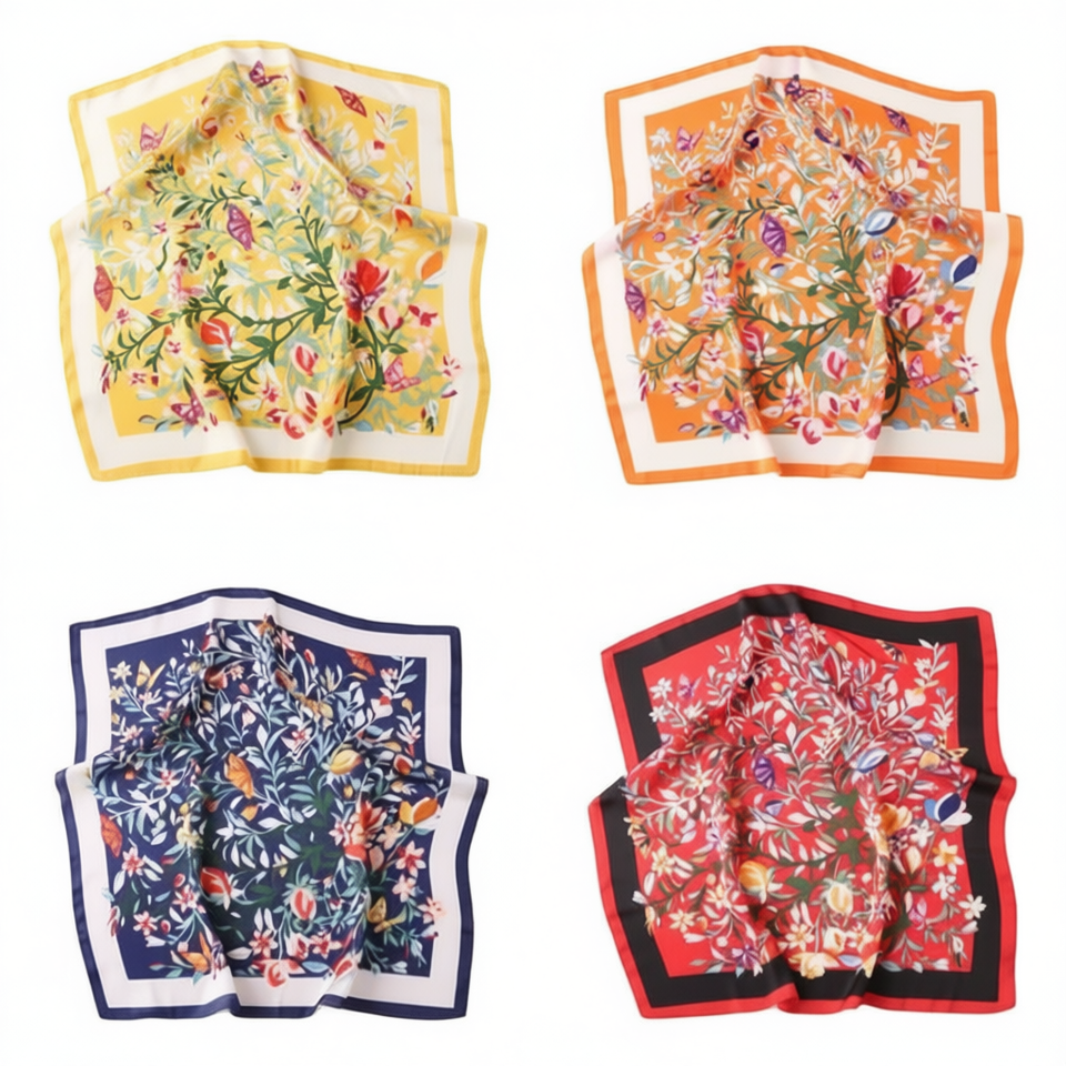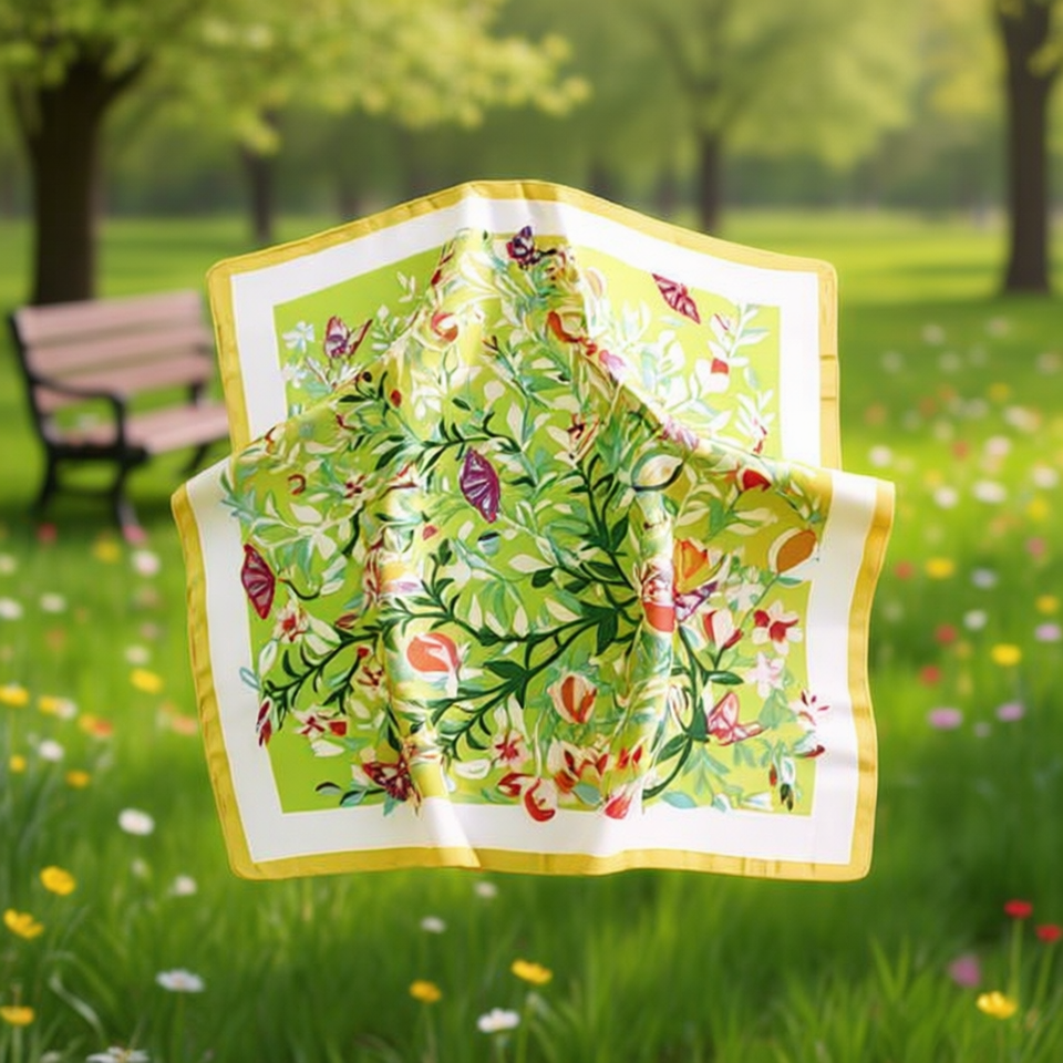 Foulard quadrato piccolo con foglie verdi e fiori 70x70 cm, accessorio moda per donna