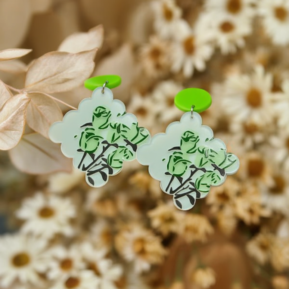 Green Painted Acrylic Earrings With Floral Design Fashion Stud Earrings