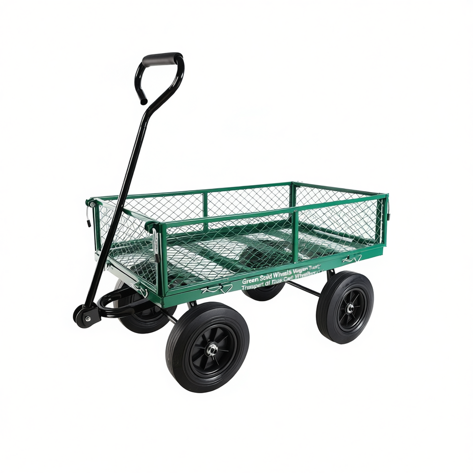 Carrello da Giardino con Ruote Solide Verdi, Vassoio in Metallo, 4 Ruote, Trasporto Manuale
