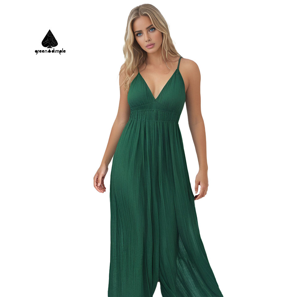 Abbigliamento donna verde tinta unita tracolla sottile aderente lungo plissettato abito Casual profondo V abito da donna Sexy