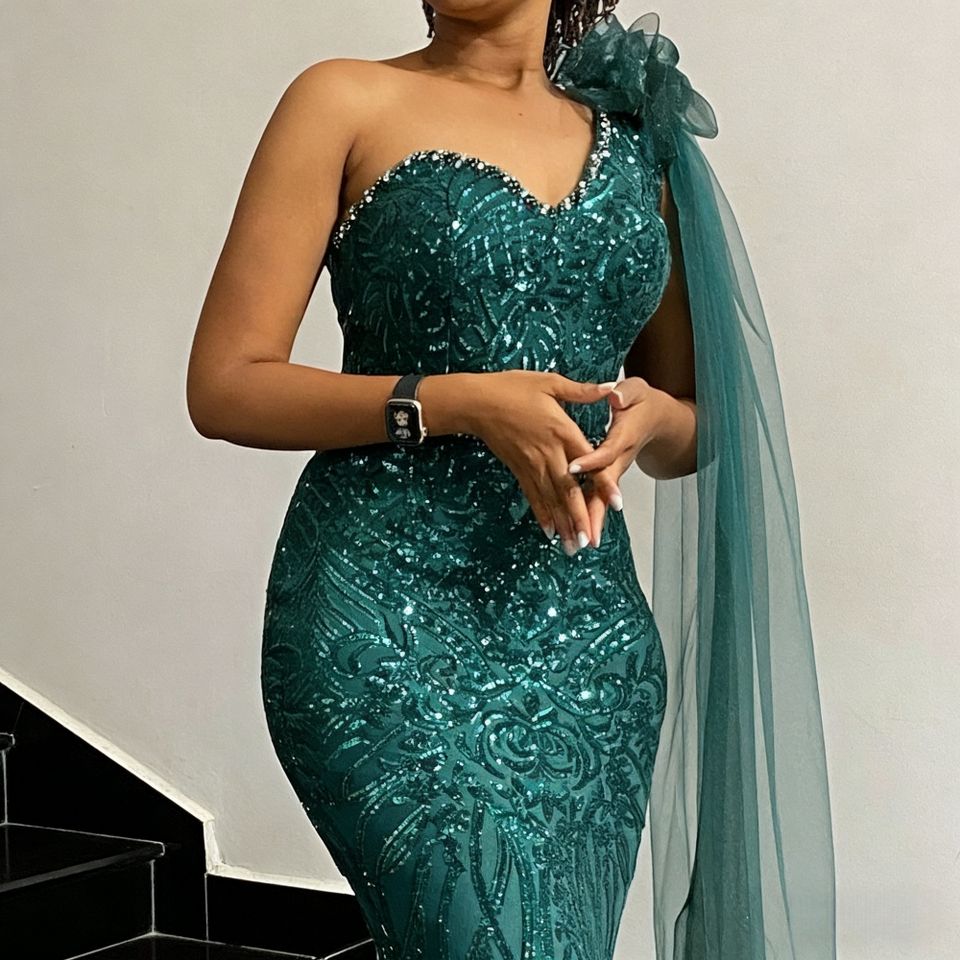 Green Women's Evening Dresses Women Fashion Blingbling One-shoulder Floor-length Dress With Shoulder Strap