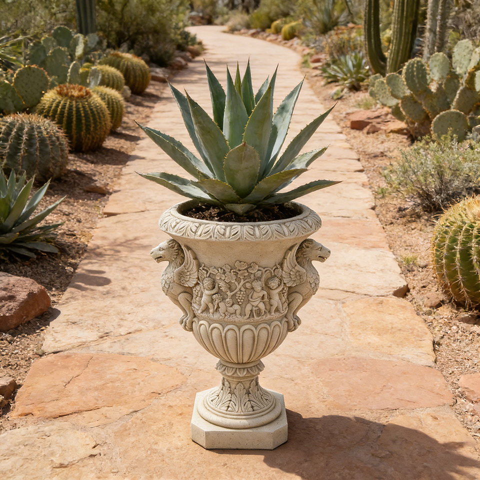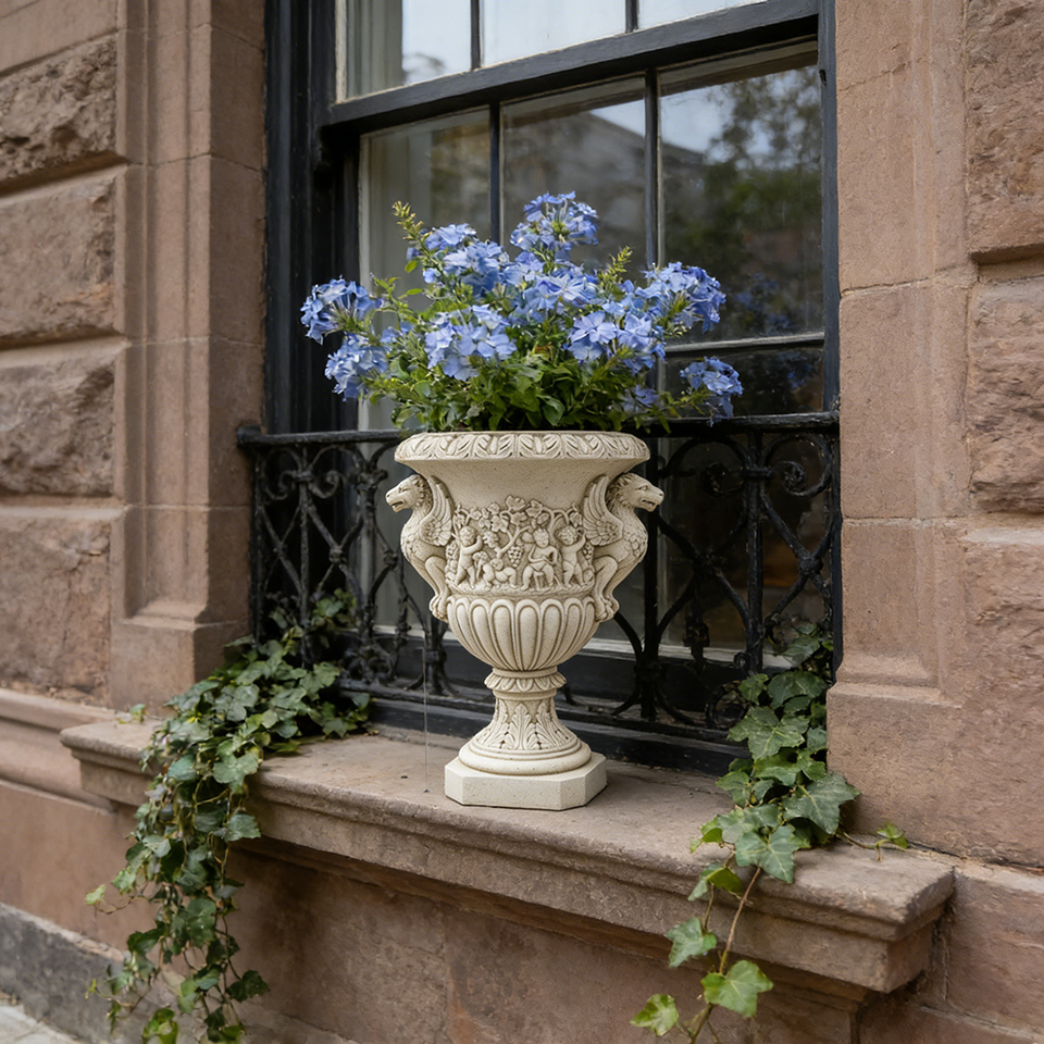 Griffin & Cherub Resin Urn Planter - Stone-Effect Finish, Renaissance Style for Rustic Cabin & Mountain Patio Displays