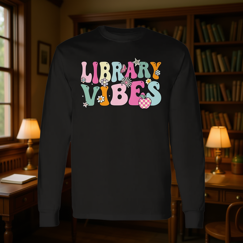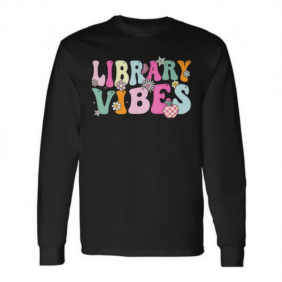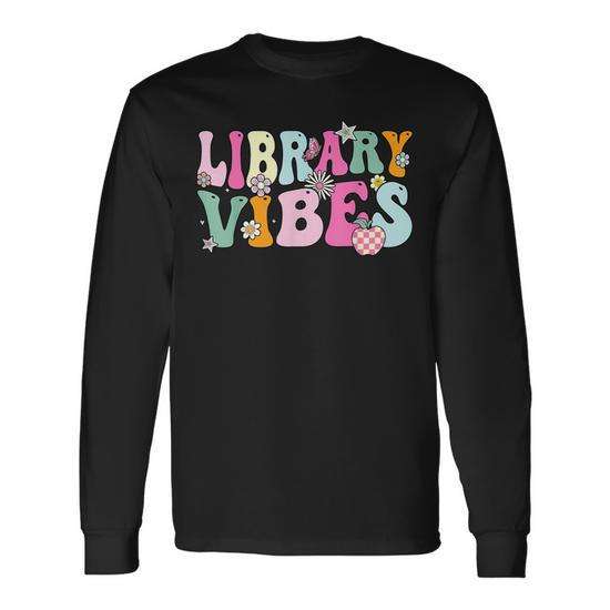 Groovy Library Vibes Retro School Library Crew T-shirt a maniche lunghe in stile vintage promozionale