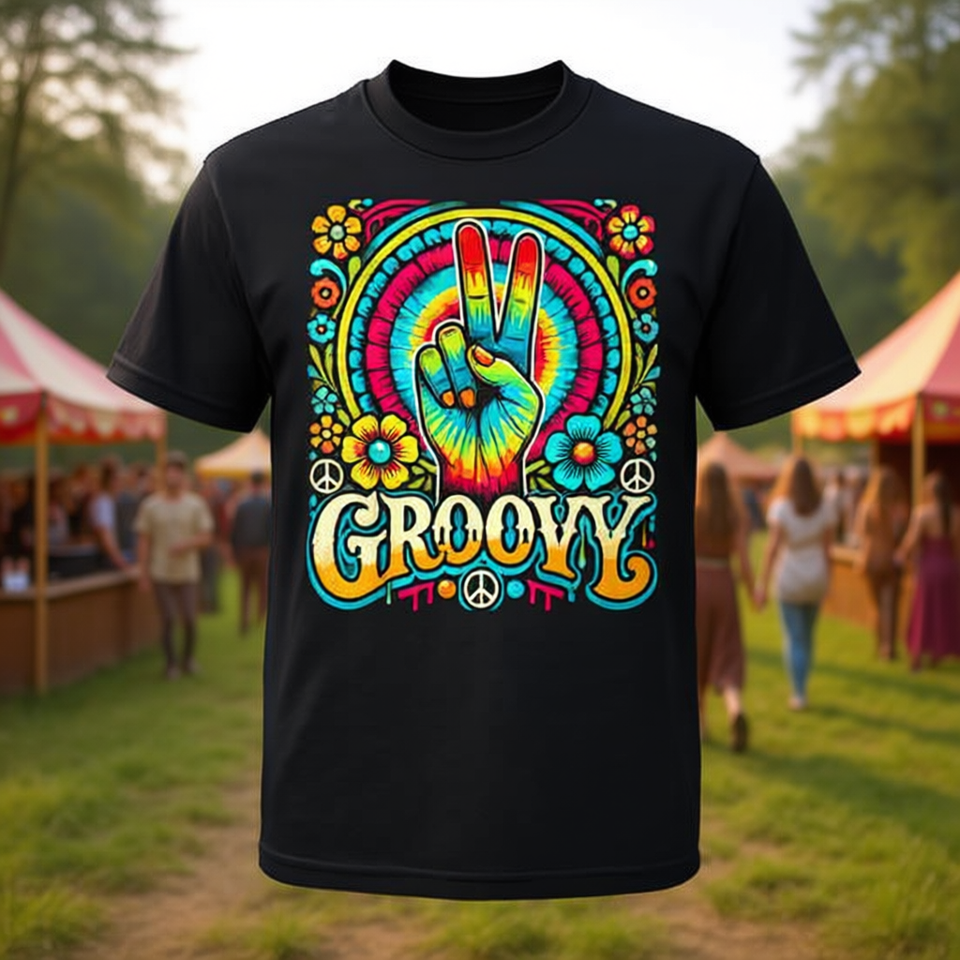 T-Shirt Hippie con Simbolo della Pace Tie-Dye, Nero, Unisex, Taglia Adulto, Collo Tondo, Manica Corta, Stampa Serigrafica
