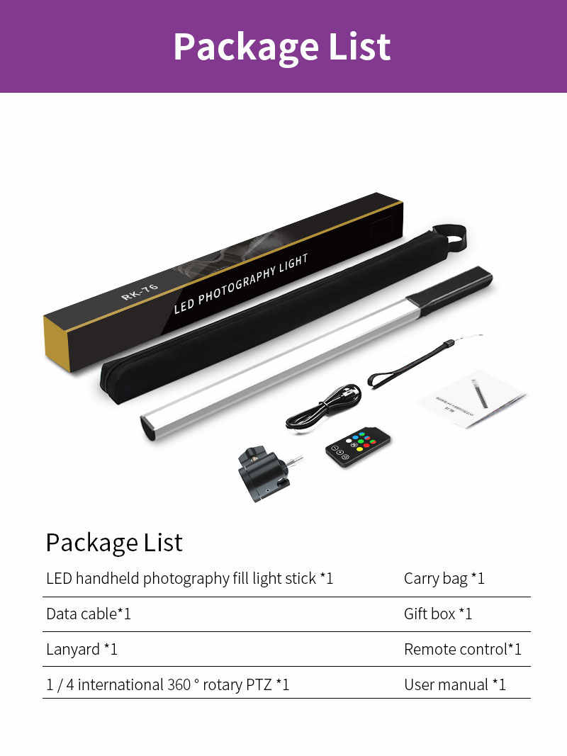 1 * bastone leggero per fotografia portatile, 1x borsa per il trasporto, 1x confezione regalo, 1x manuale utente, 1xtype cavo C, 1x landyard,1xrotation cradle