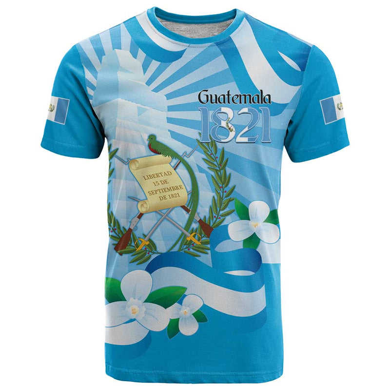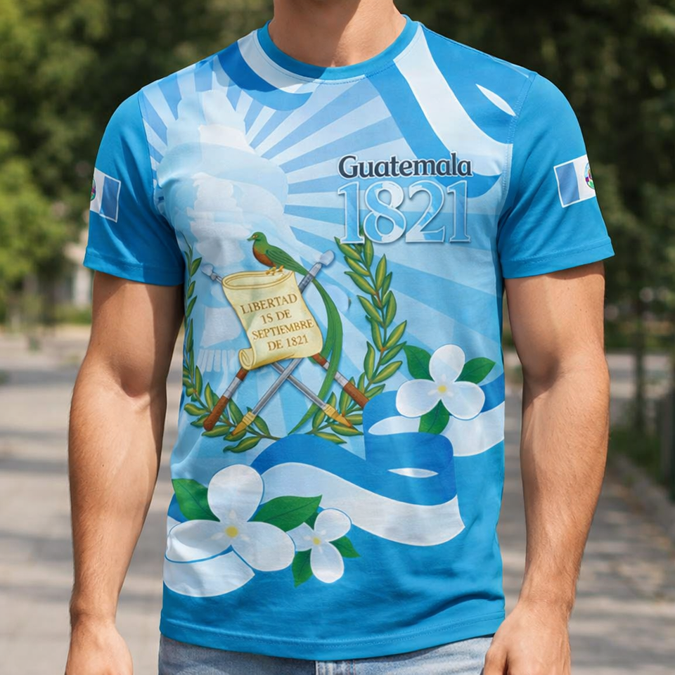Maglietta per il Giorno dell'Indipendenza della Guatemala dal 1821, con stemma e Tikal, 1821 9.15, in poliestere