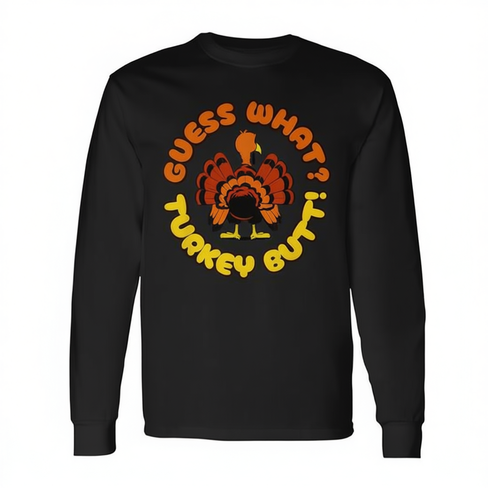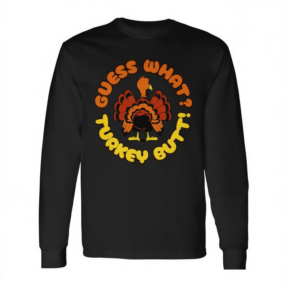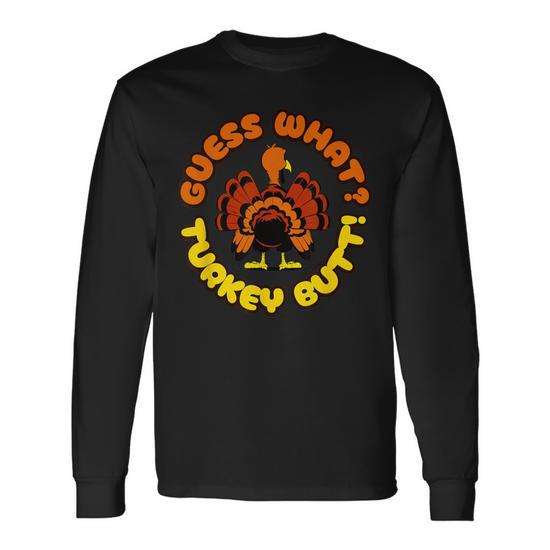 Maglietta a maniche lunghe con stampa serigrafica 'Guess What Turkey Butt' per adulti unisex, girocollo, abbigliamento per feste del Ringraziamento
