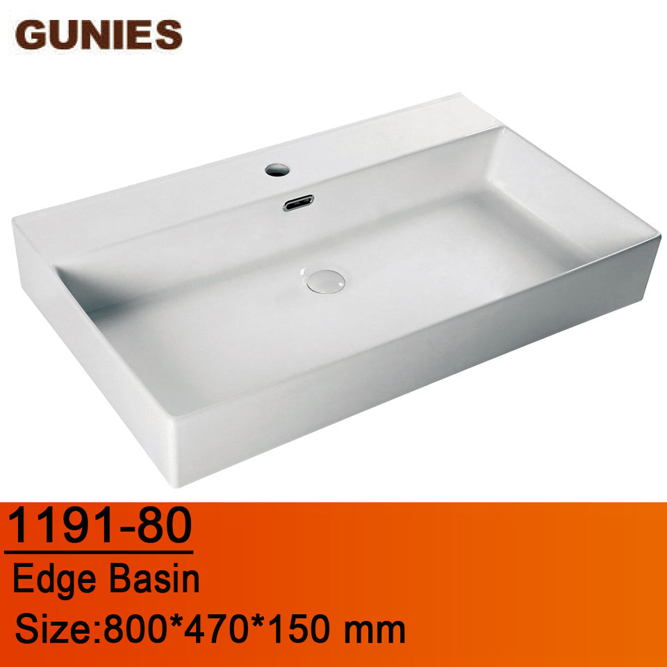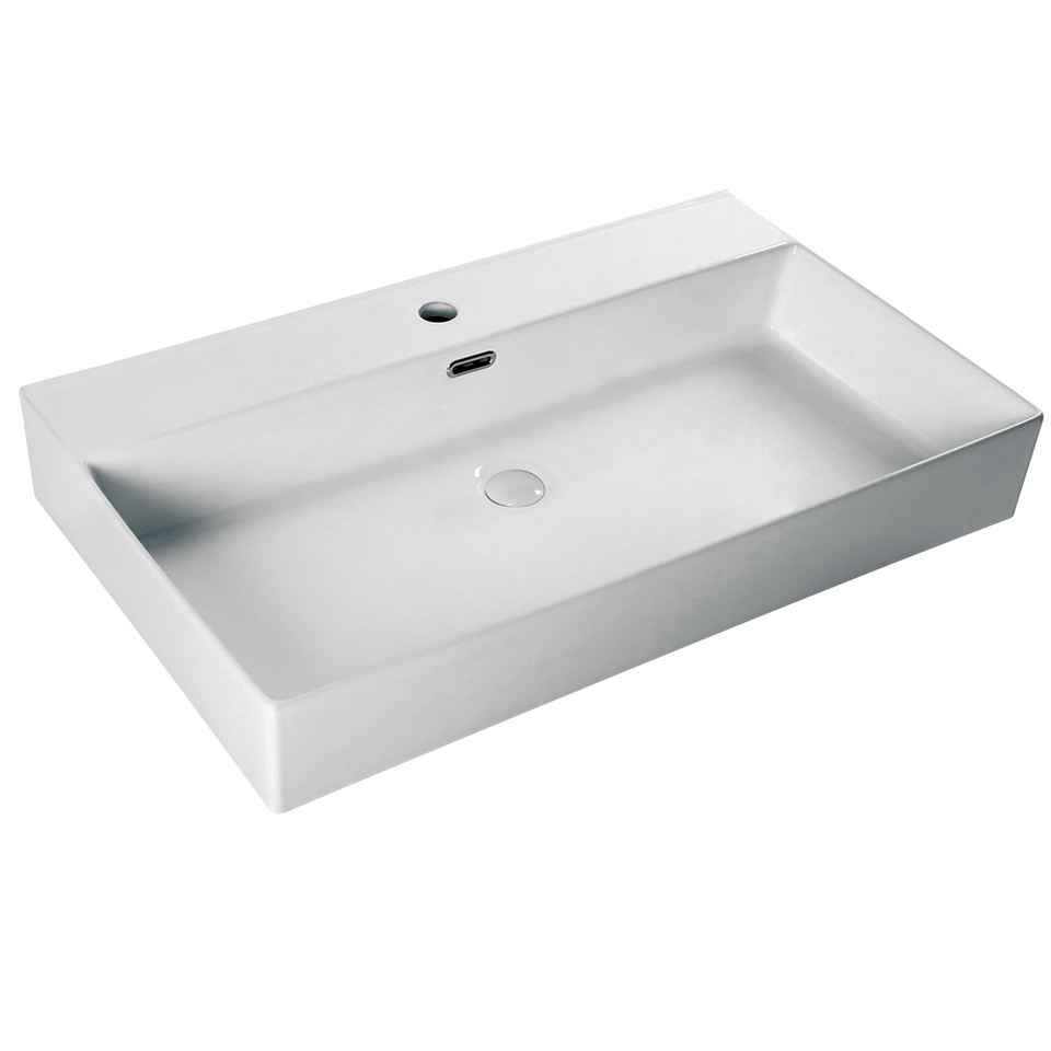 Lavabo Rettangolare Moderno in Ceramica Bianca Gunies, da Appoggio, con Foro Singolo, Ecologico, per Bagno