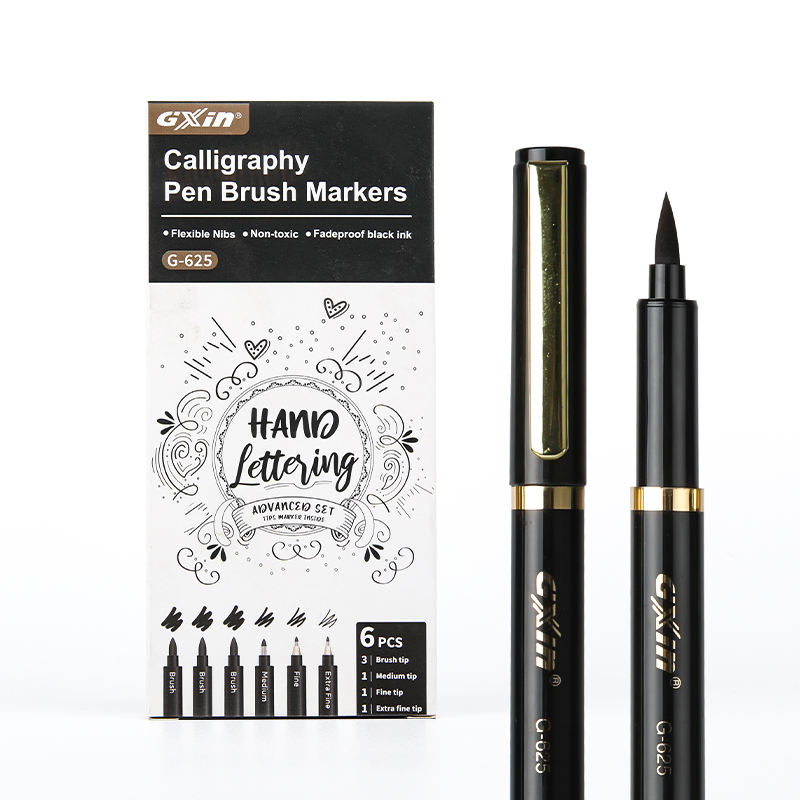 Gxin Set da 6 Pezzi di Pennarelli con Punta a Pennello per Lettering, Pennini Flessibili, Penne Atossiche, 6 Misure 0,5mm 0,2mm, Inchiostro Nero per Calligrafia