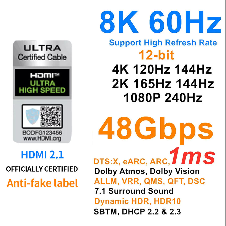 Compatibilità HDMI 2.1: Supporta risoluzioni 8K@60Hz e 4K@120Hz, fornendo video ultra-alta-definizione e HDR dinamico per un'esperienza di visione superiore.