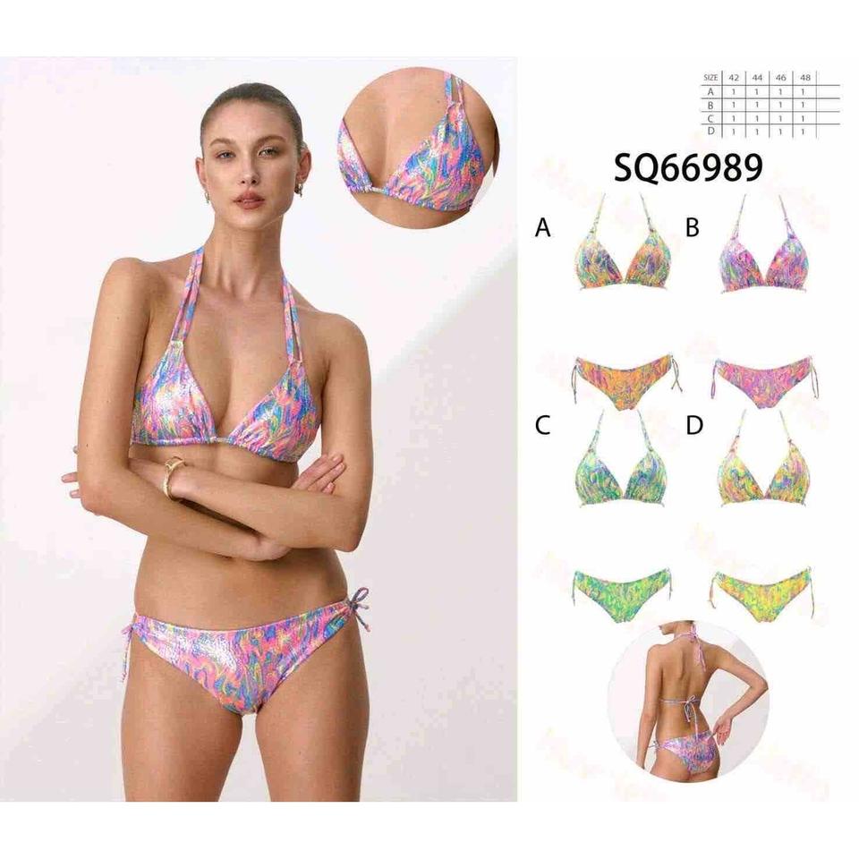 Set bikini HDJ con stampa multicolore, top con laccetti e slip con laccetti laterali, taglia 42 44 46 48