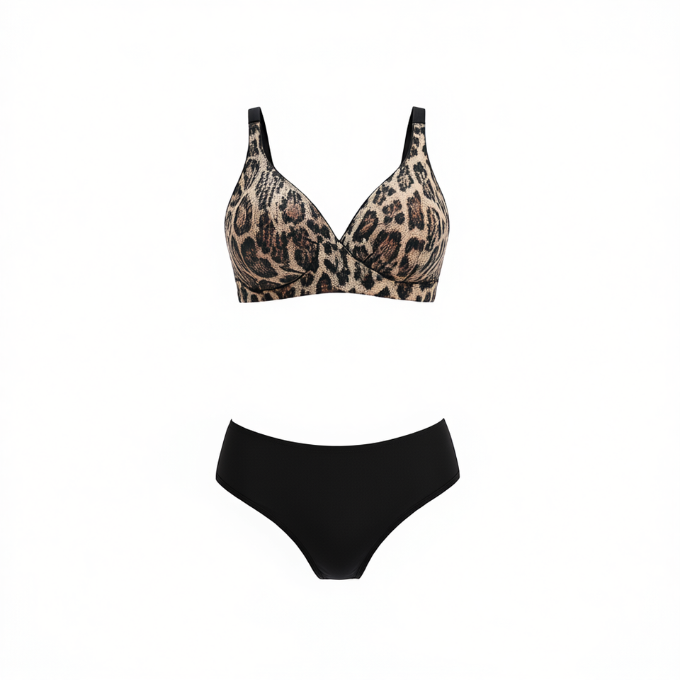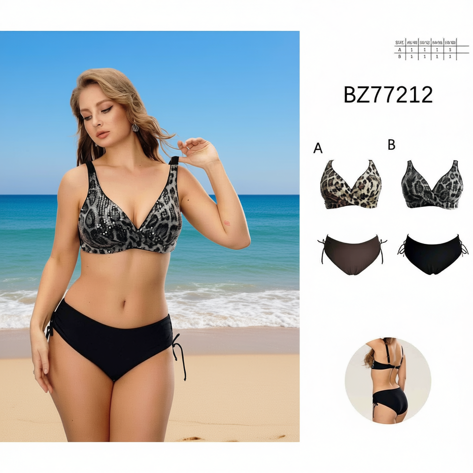 Set Bikini Plus Size HDJ con Stampa Leopardata, Top Nero e Slip con Scollo a V Profondo, Laccetti Laterali, Costume da Bagno 46-56