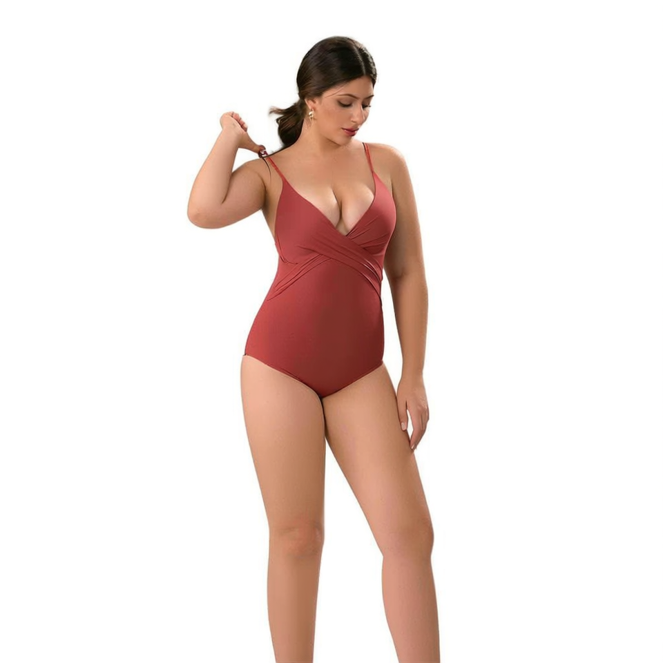 Costume da bagno intero HDJ Plus Size con controllo della pancia, scollo a V profondo, rosso vino BZ77069