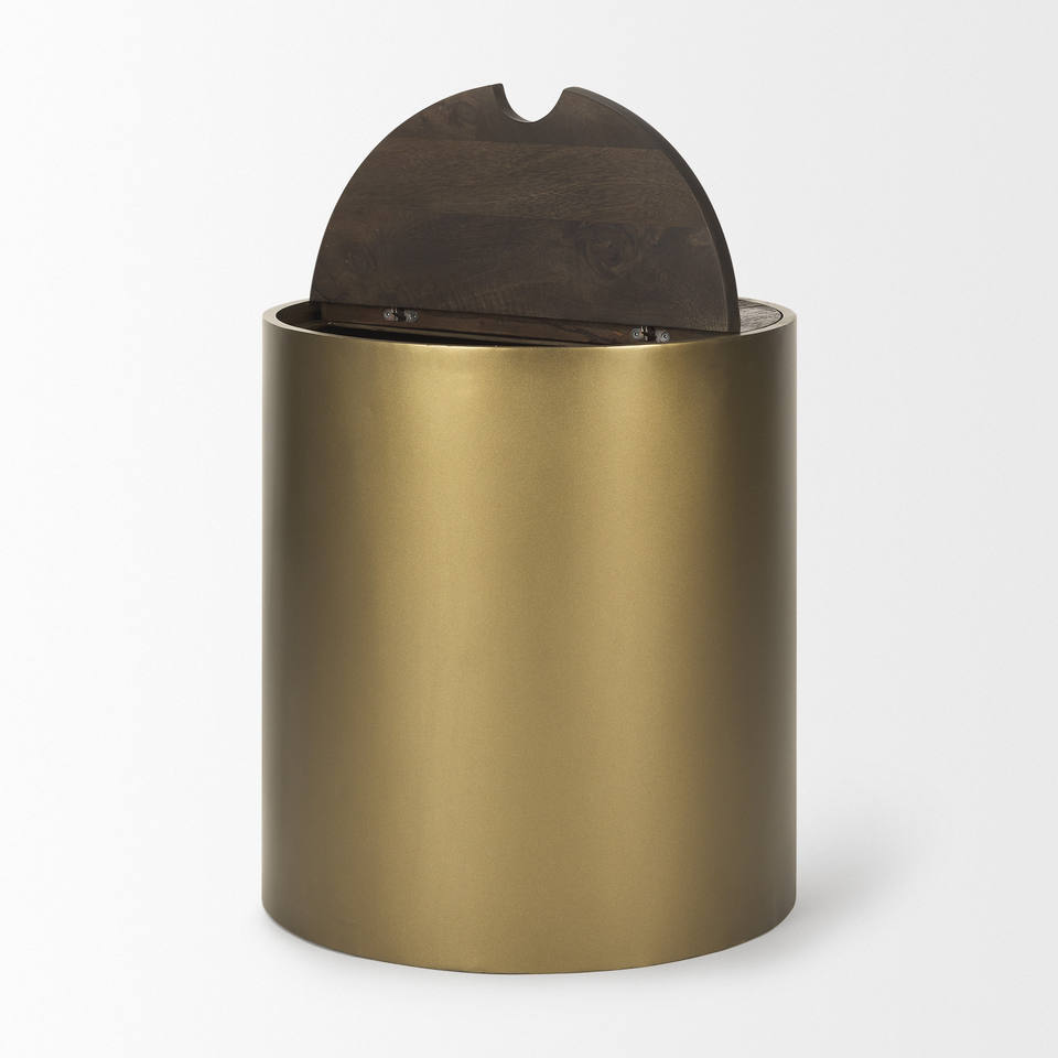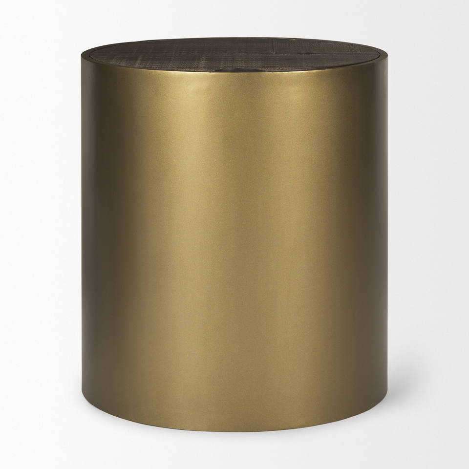 HMS 22\" Antiqued Gold and Brown Metal Solid Wood Drum End Table with Storage for Living Room Furniture