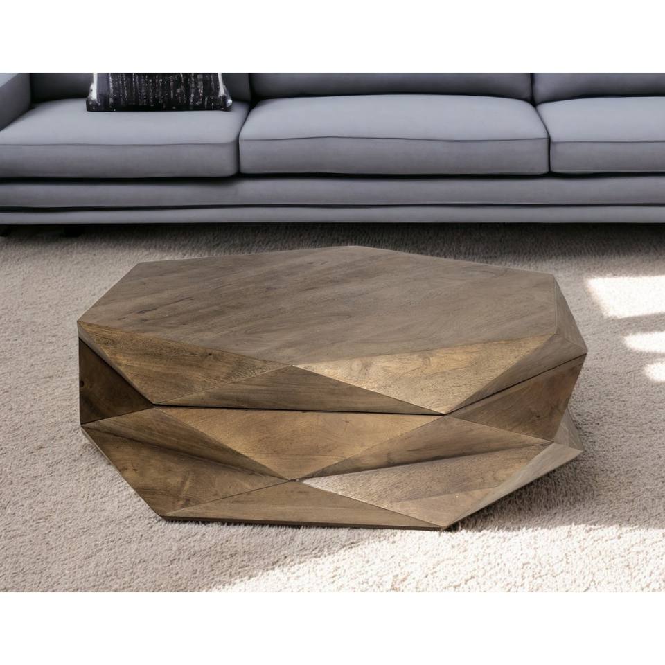 HMS 48\" Brown Wood Hexagon Coffee Table Minimalist Design Living Room Furniture with Oak Metal Marble for Home Office Use