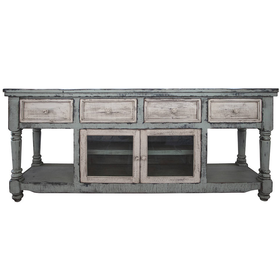 HMS 70 Blue and White Distressed Open Shelving Solid Wood TV Stand