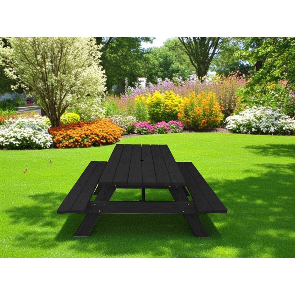 HMS Solid Black Wood Dining Set with Two Benches Including Umbrella Hole-for Garden Use