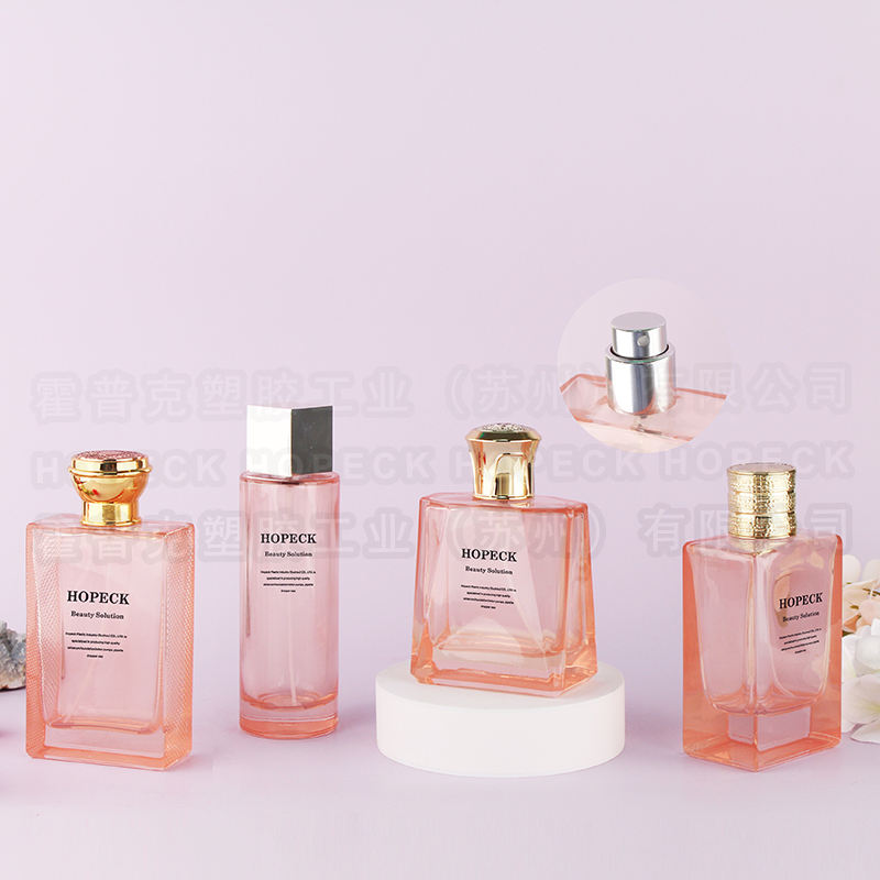 HOPECK Light Pink Perfumery Glass Packaging with Spray Pumps Engraving & Hot Stamping Customized Luxury-shaped Outer Covers