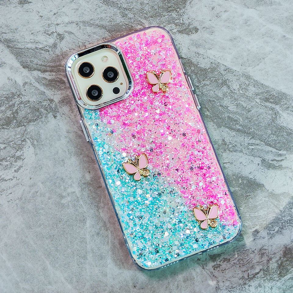 Nome:Design per ragazze: Custodia per telefono con farfalla 3D glitterata, elegante e scintillante in resina epossidica