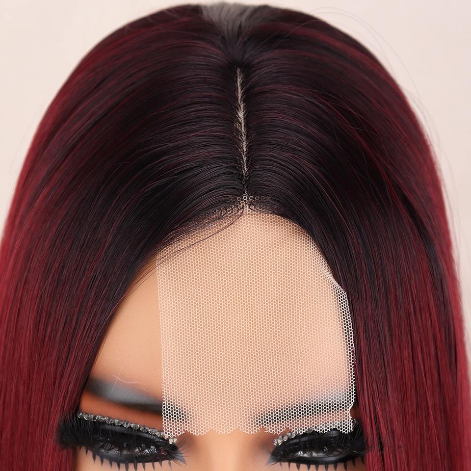 Parrucca sintetica lunga liscia 32 pollici, rosso vino (ombré), in fibra termoresistente, con pizzo e riga centrale, 1 pezzo, realizzata a macchina