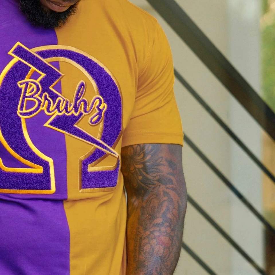 Half Purple Gold Omega Bruhz Greek Life Chenille Embroidery Tee Custom Fraternity Apparel Wholesale Mens Cotton Shirt