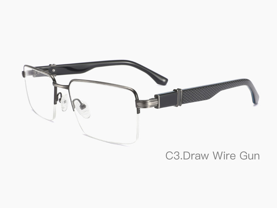 Occhiali da vista da uomo con montatura in metallo semi-rimless, anti-luce blu, design rettangolare.