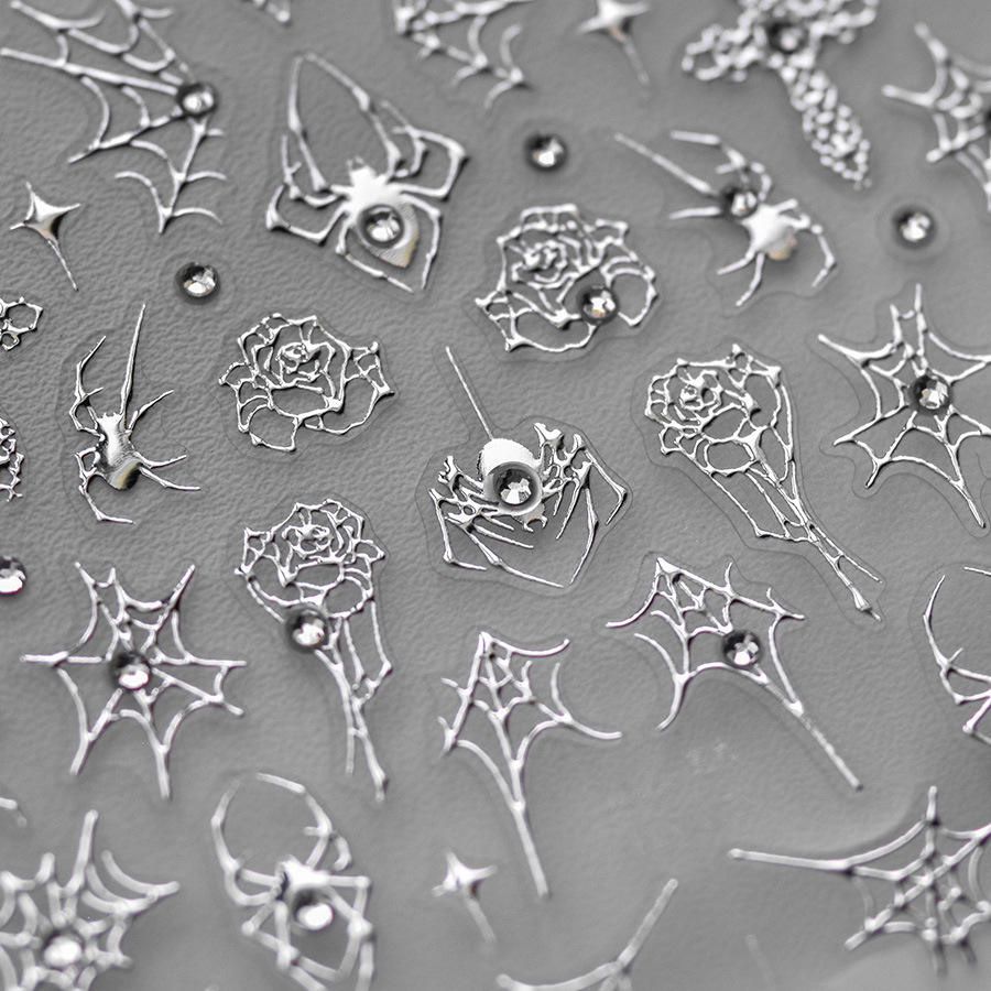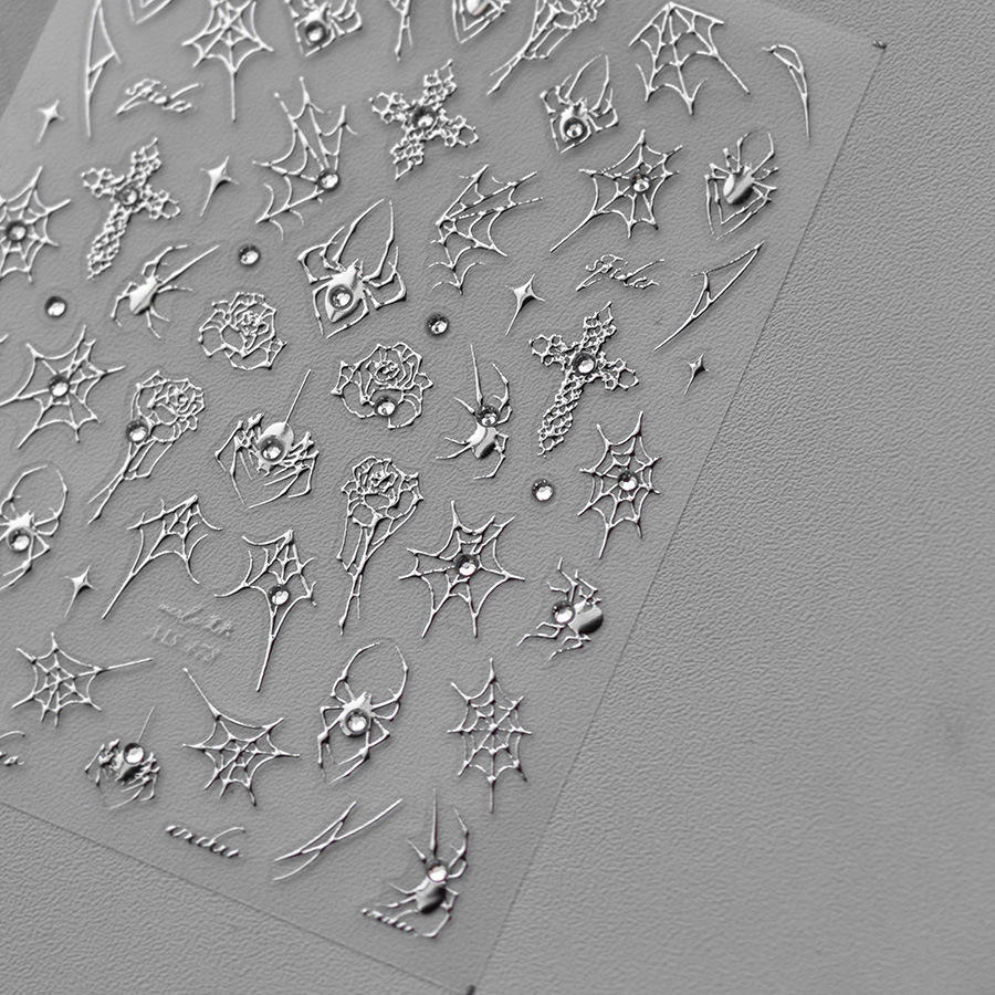 Adesivi per unghie di Halloween con croce scura ragnatela rosa cristallo di diamante stile gotico bianco nero argento decalcomanie Manicure adesivo 3D