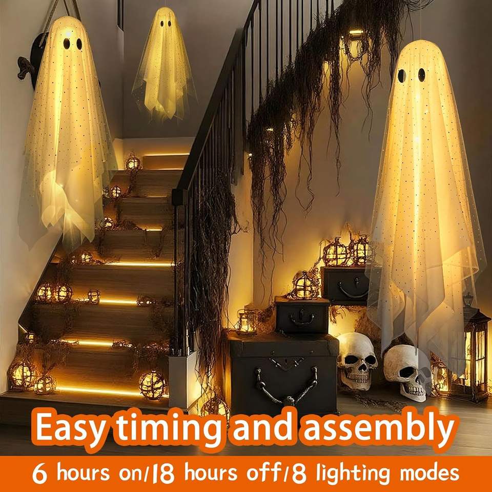 Decorazioni di Halloween: Set di 3 Fantasmi Luminosi Appesi per Interni/Esterni, Ornamenti per Giardino e Alberi