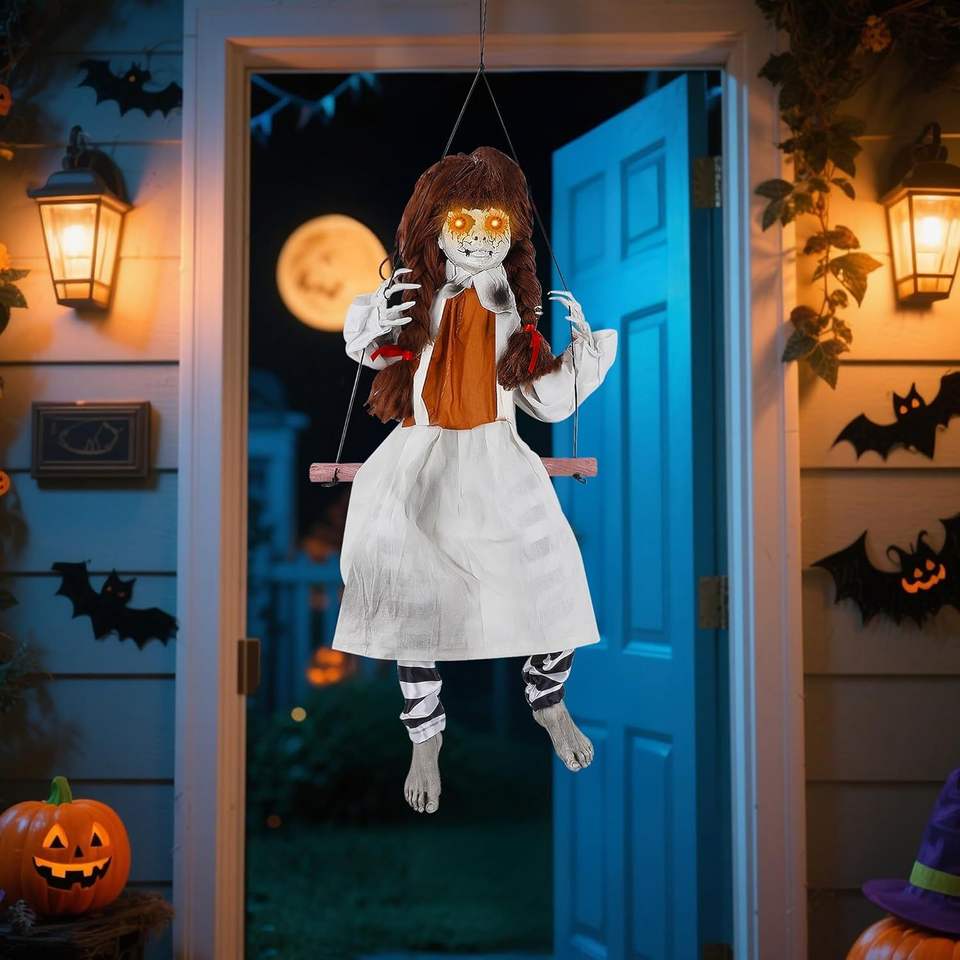 Decorazioni di Halloween: Ragazza Animatronica a Grandezza Naturale su Dondolo con Suoni Spettrali, Oggetto Scenico da Esterno per Halloween