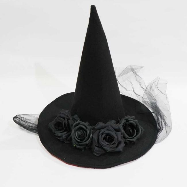 Halloween Witch Pointed Hat with Veil Rose Lace Rose Felt Cap Baroque Gothic Queen Headwear Accessory for Masquerade Cosplay