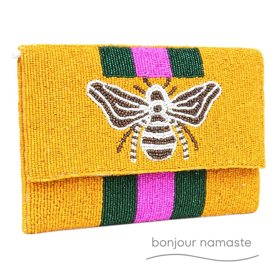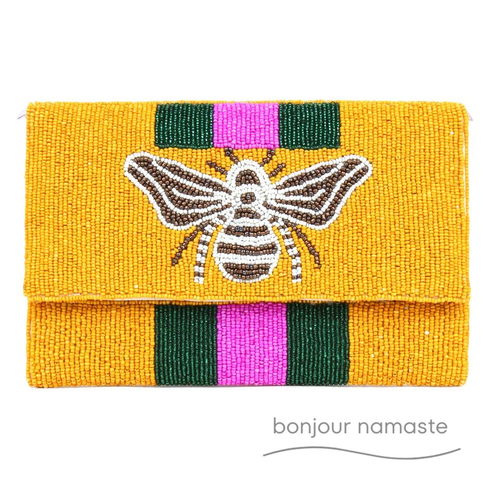 Lady Hand Beaded Clutch Bee Embroidery | Saffron Bottle Green for Colors | Artisan Vintage Evening Bag | Magnetic Closure |