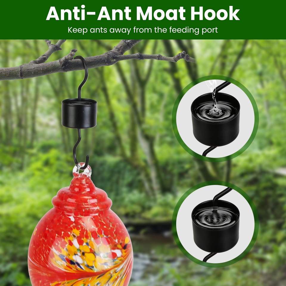 Mangiatoia per Colibrì in Vetro Soffiato a Mano da 33OZ con 5 Porte di Alimentazione a Fiore, Posatoio, Fossa Anti-Formica e Gancio a S in Canapa per Forniture per Uccelli