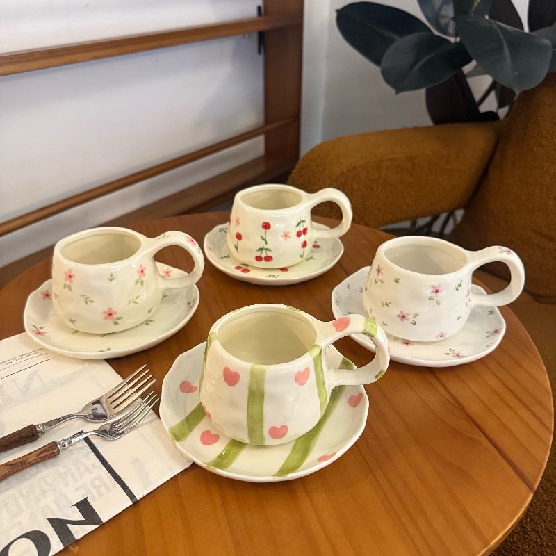 Set di tazze da tè da caffè in ceramica 2025 Chic dipinto a mano con piattini con Design a fiocco rosa inclusi tazze di porcellana
