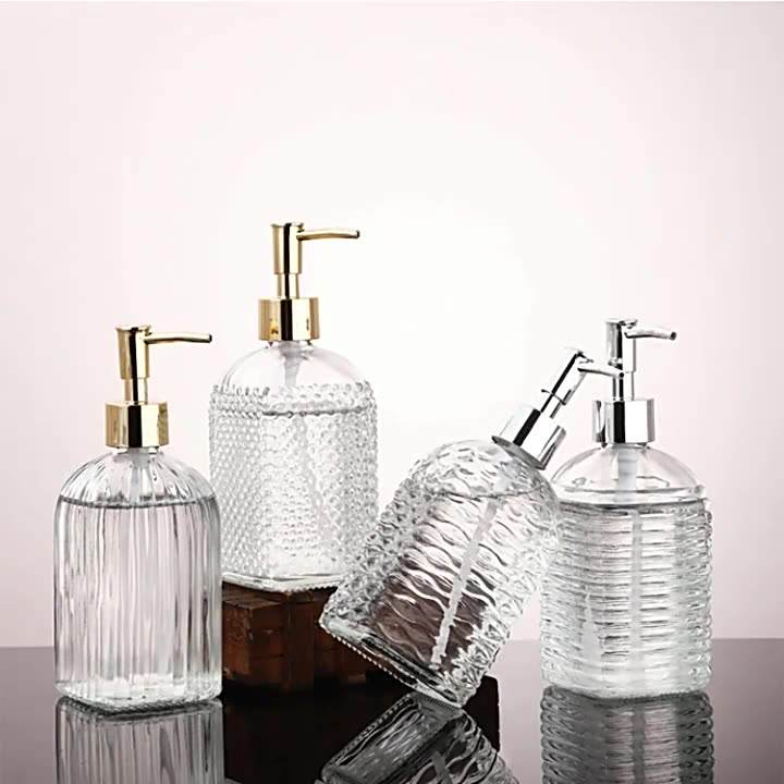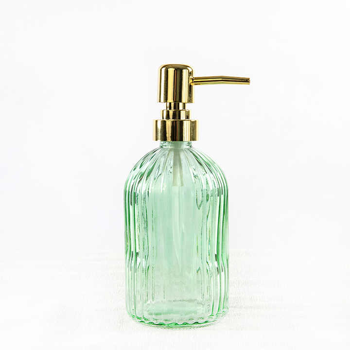 Flaconi Rotondi in Vetro Verde, Grigio, Blu e Trasparente da 450 ml per Igienizzante Mani, Shampoo, Bagnoschiuma e Gel Doccia con Pompa Dorata