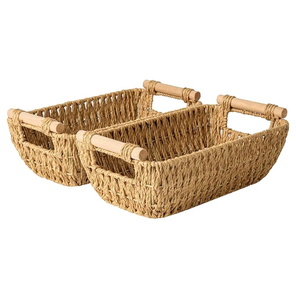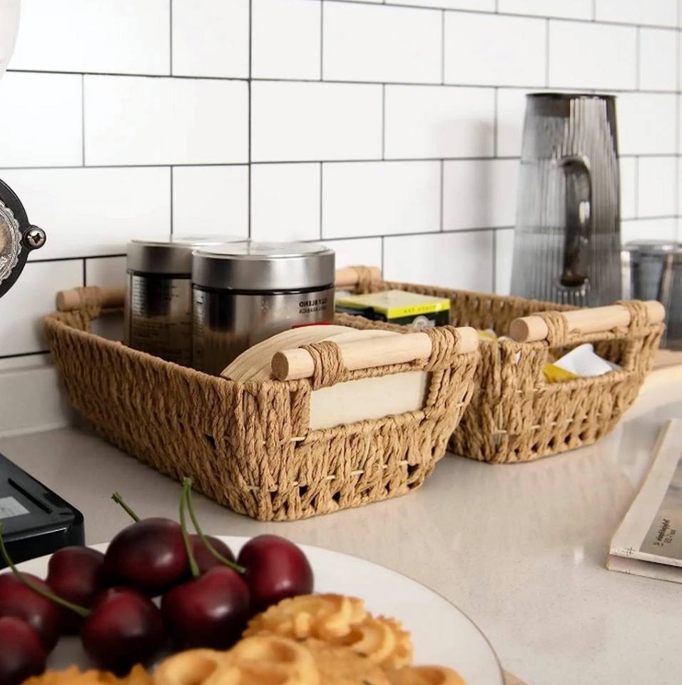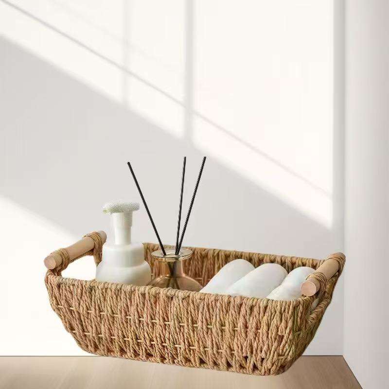 Piccola cesta in vimini intrecciata a mano, cesto di stoccaggio in corda di carta, con manico in legno