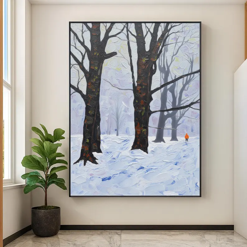 Dipinto a mano paesaggio invernale dipinto a olio, albero strutturato foresta innevata con figura solitaria arte della parete per soggiorno o ufficio
