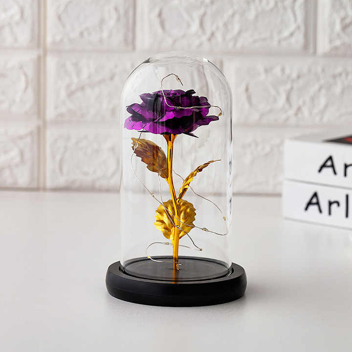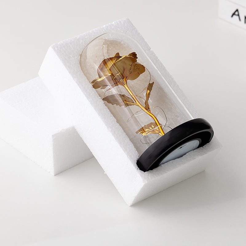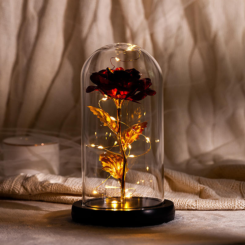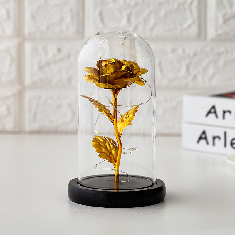 Soffiato a mano Trasparente Circolare Cilindro di Bellezza E La Bestia In Oro Del Fiore della Rosa In Cupola di Vetro Con La Luce del LED
