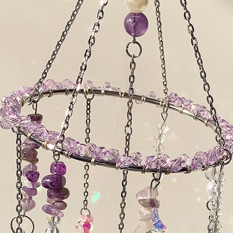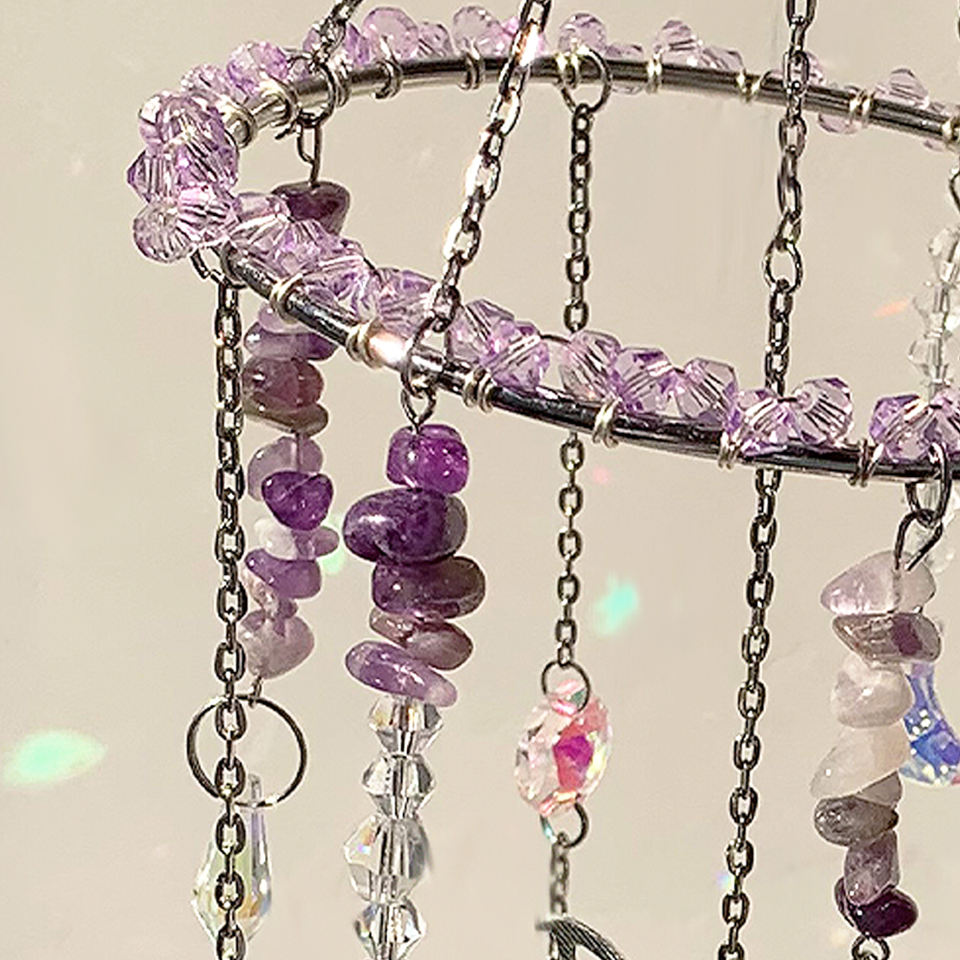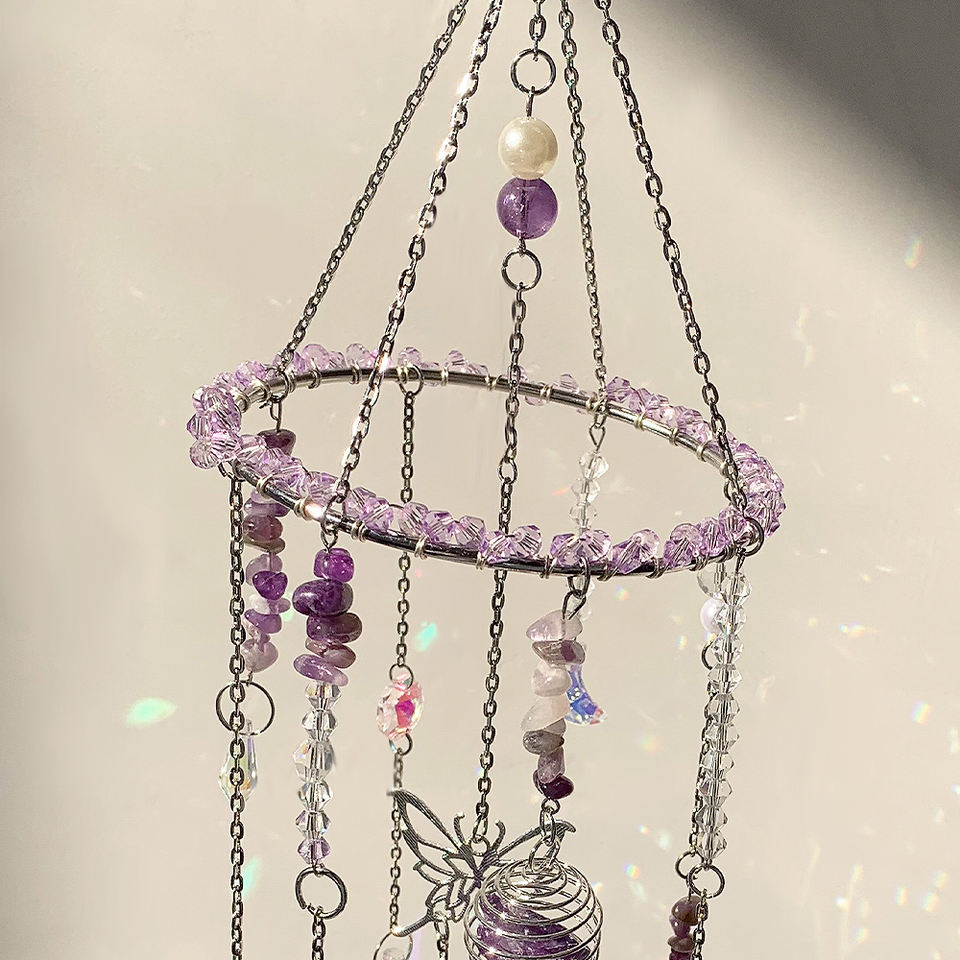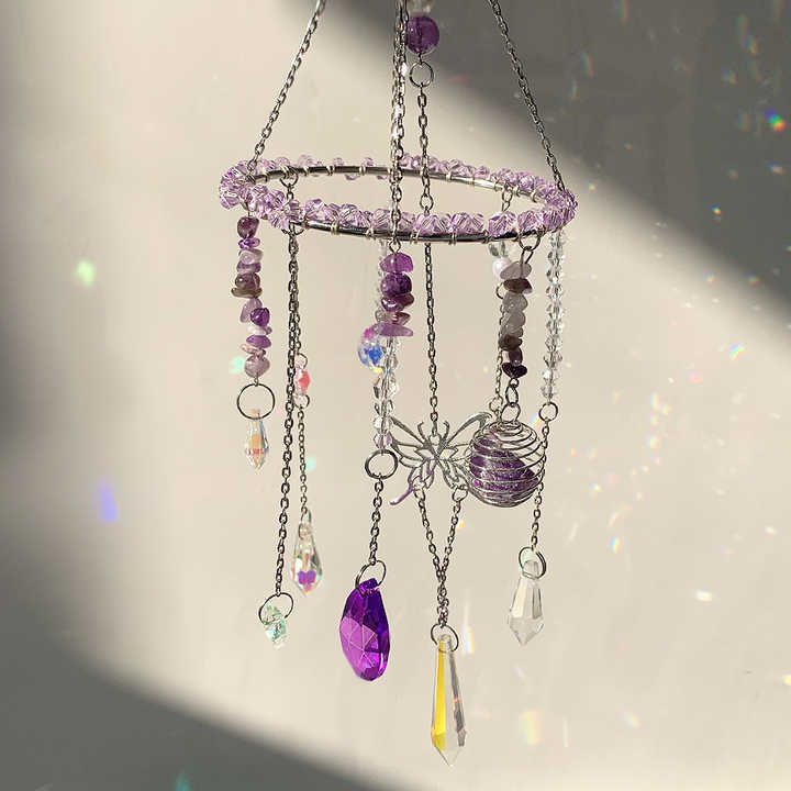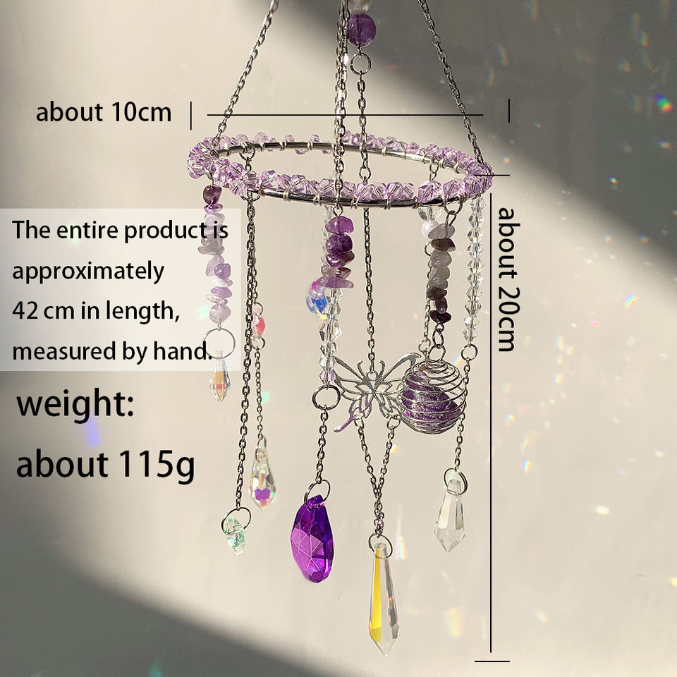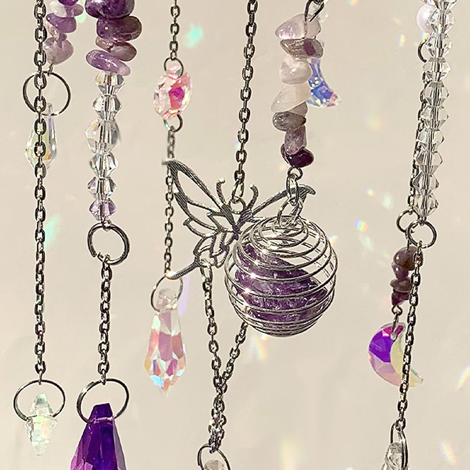 Ciondolo Artigianale in Cristallo di Ametista, Acchiappasole con Farfalla in Metallo e Gocce di Vetro, Decorazione Pendente per Casa e Ufficio, Pietra Curativa dell'Amore