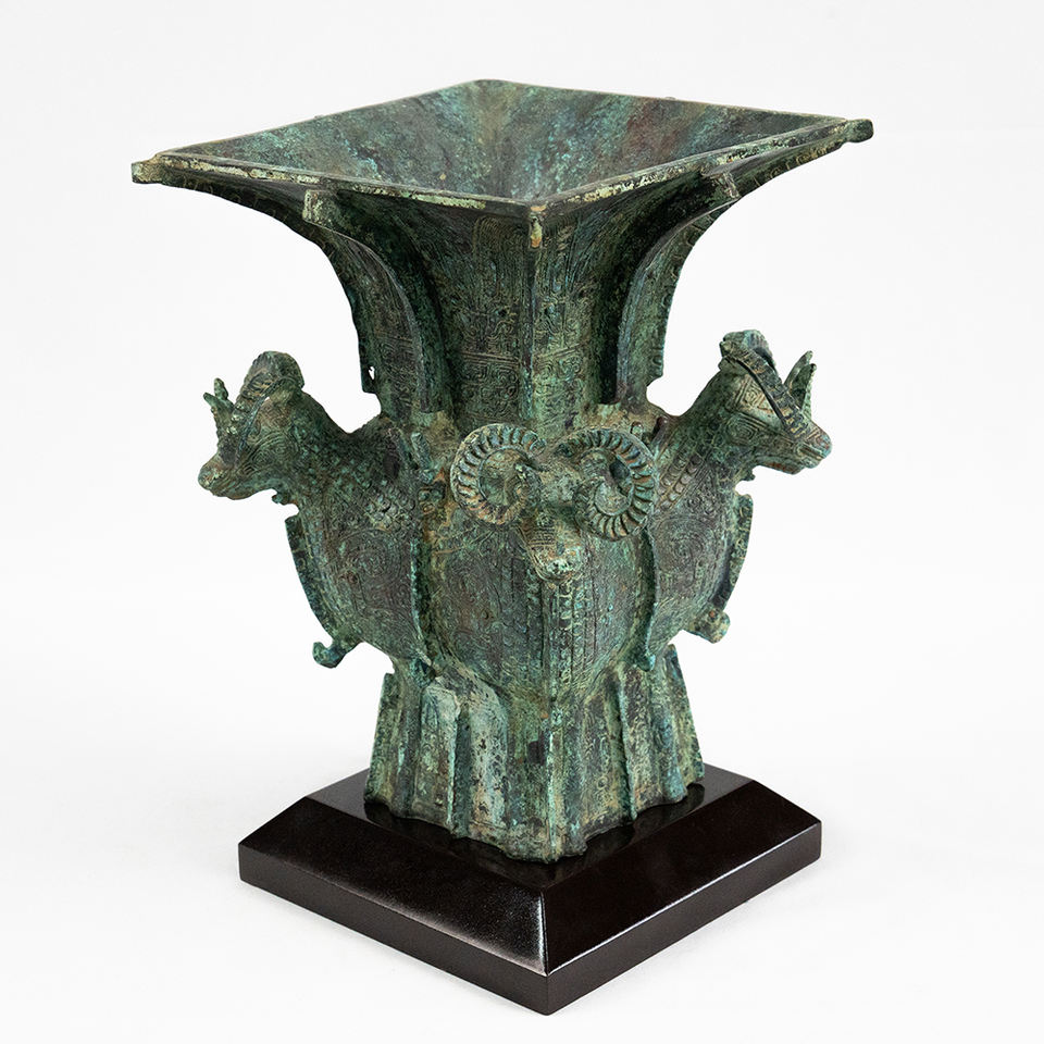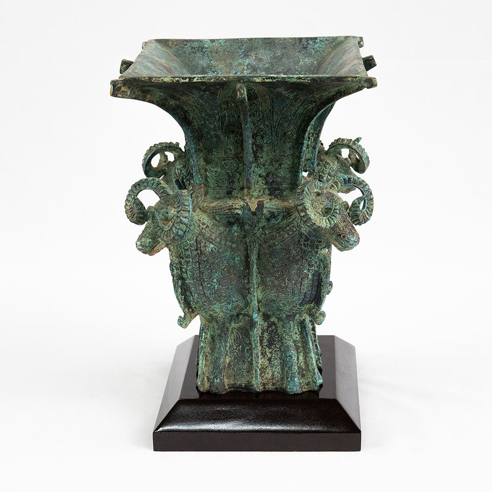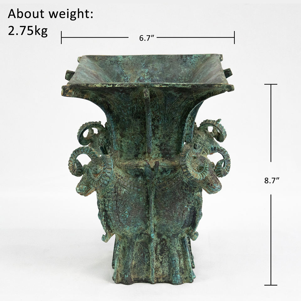 Vaso per Vino in Bronzo Cinese Stile Antico Artigianale con Design a Quattro Arieti per Collezionisti ed Esposizioni