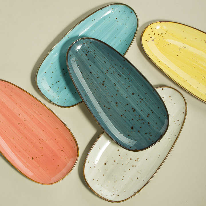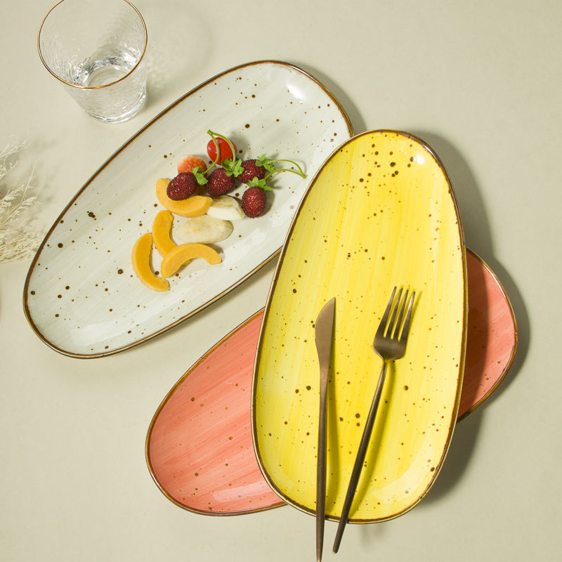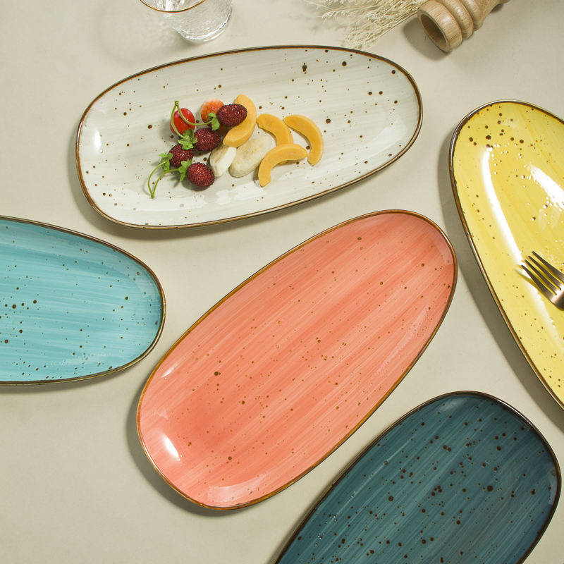 Piatto ovale artigianale in ceramica di colori assortiti piatti rustici grandi piatti da pranzo lunghi in porcellana 13 pollici per ristorante