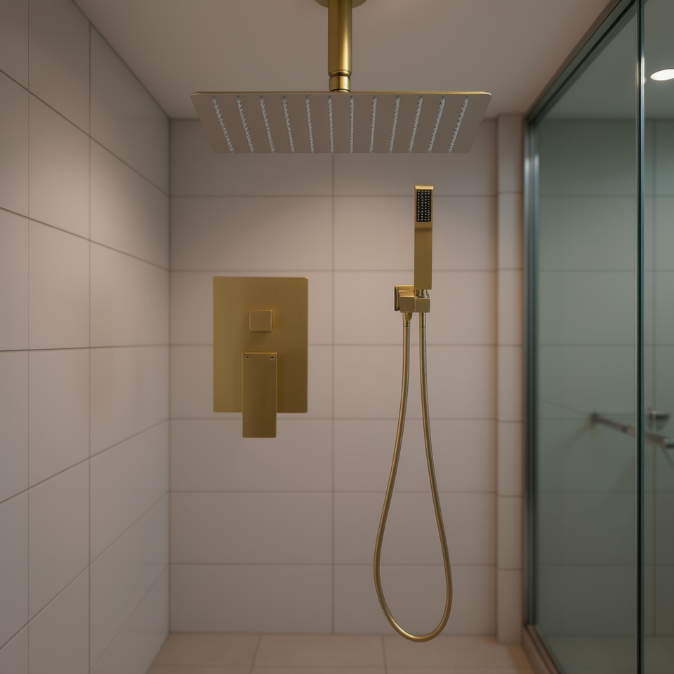 Handheld And 12 Inch Shower Head Combo Set Ceiling Mounted Brass Finish Bathroom Minimalist Design
