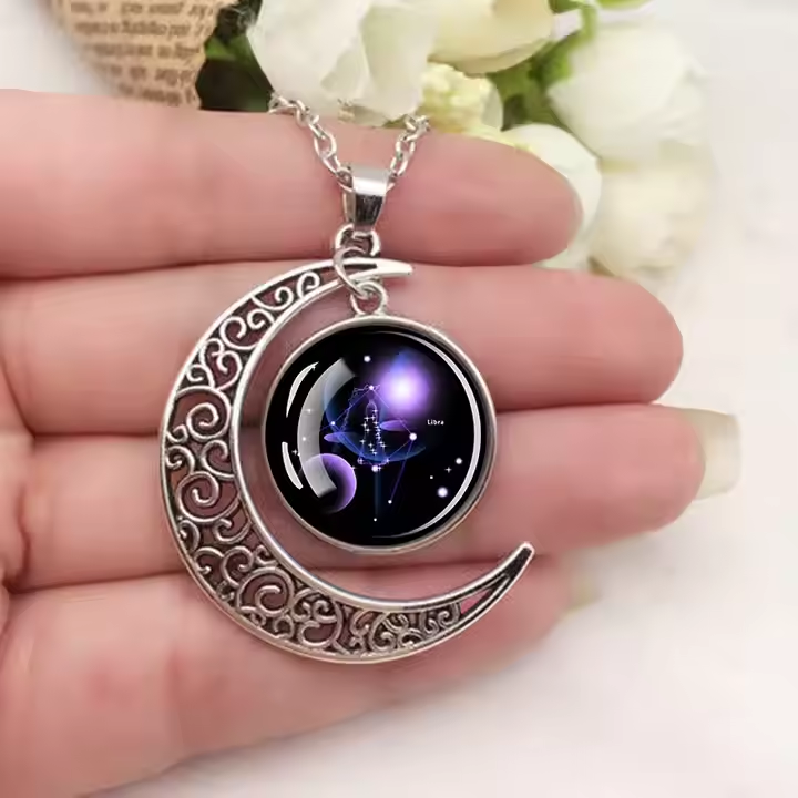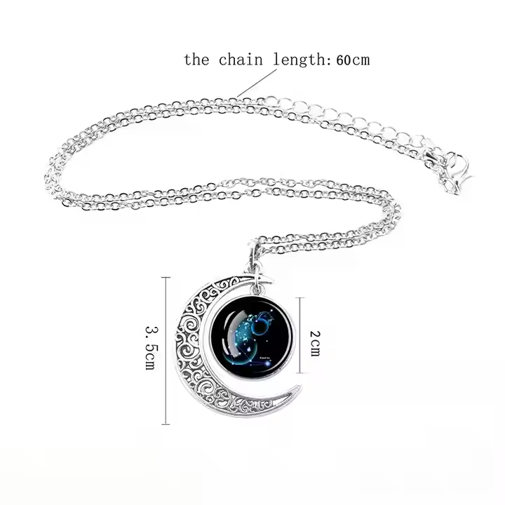 Handmade 12 Horoscope Necklace Aries Leo Gemini Libra Virgo Zodiac Signs Glass Dome Crescent Moon Pendant Necklace