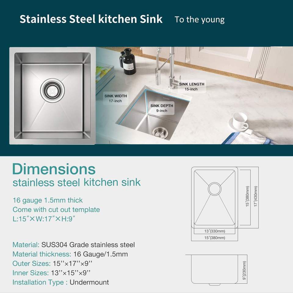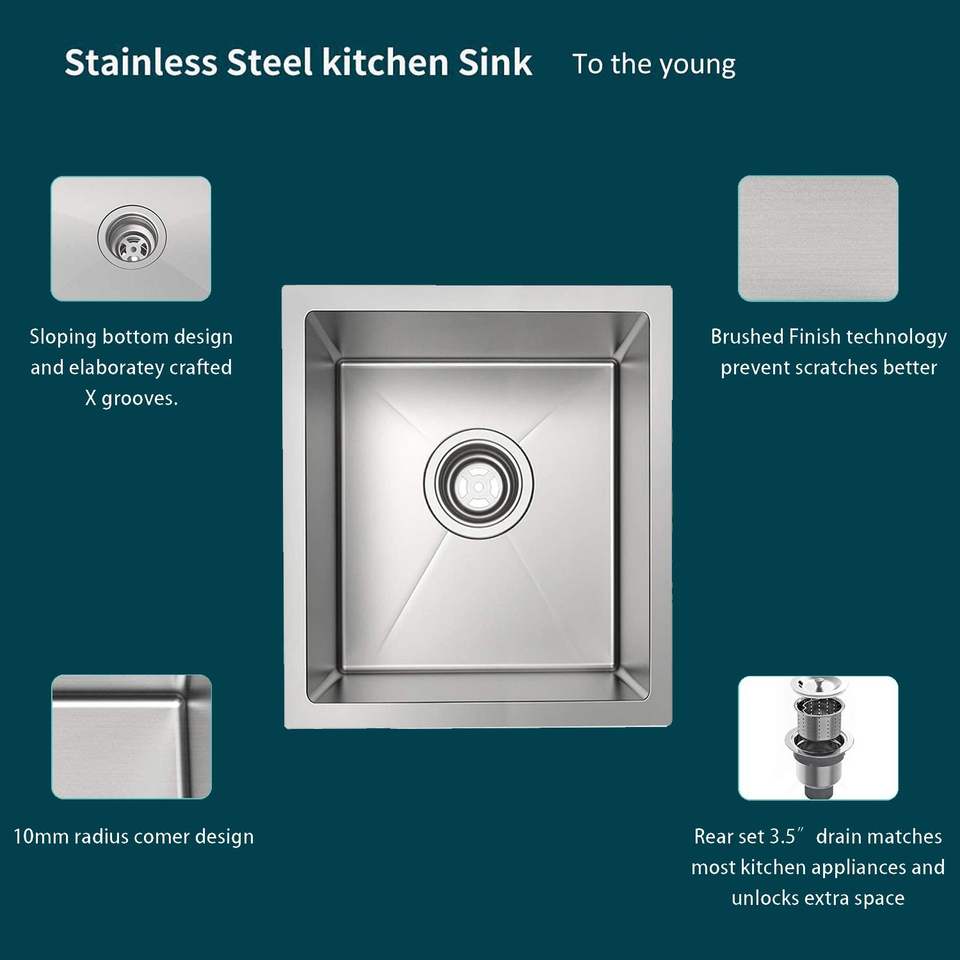 Lavello da Cucina Artigianale 15 X 17 X 9 Pollici, Vasca Singola in Acciaio Inox 16 Gauge, Design Elegante da Incasso