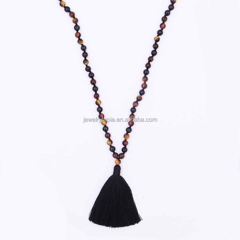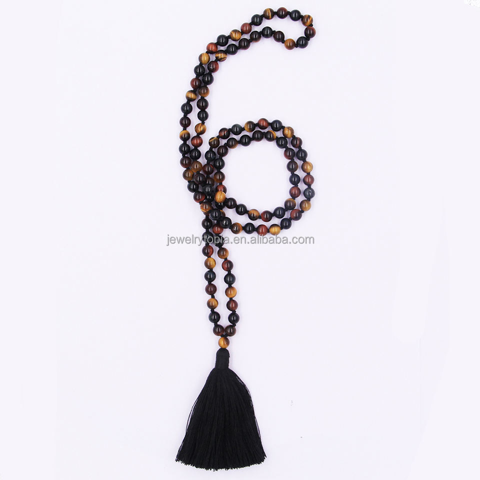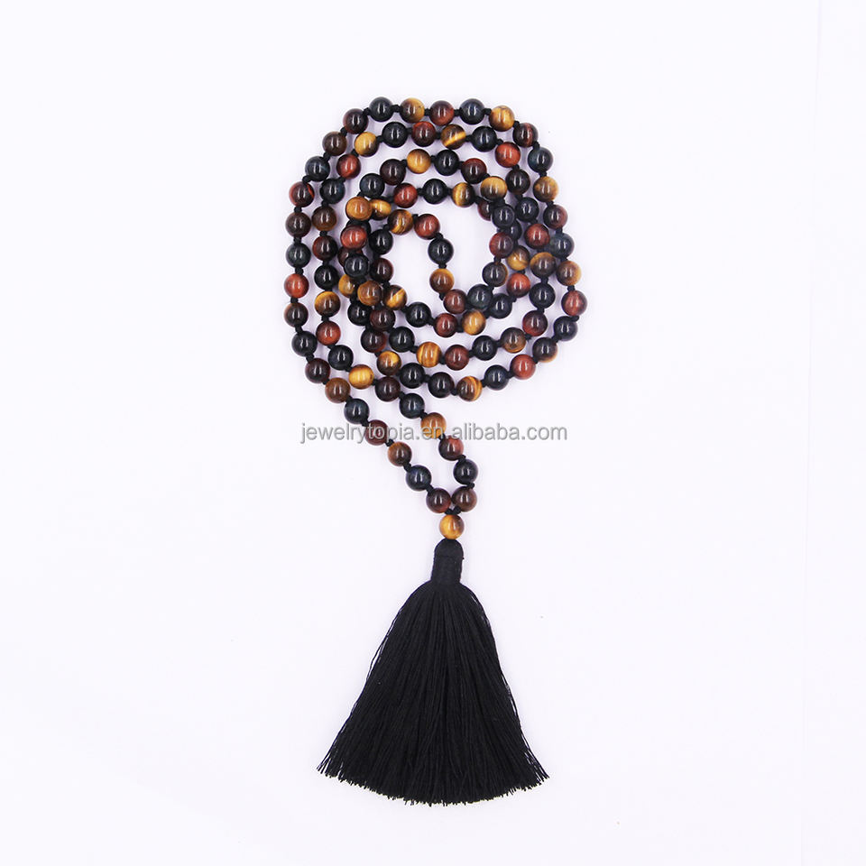 Bracciale Mala 108 Fatto a Mano con Perline di Quarzo Naturale a Tre Colori e Nappa Nera