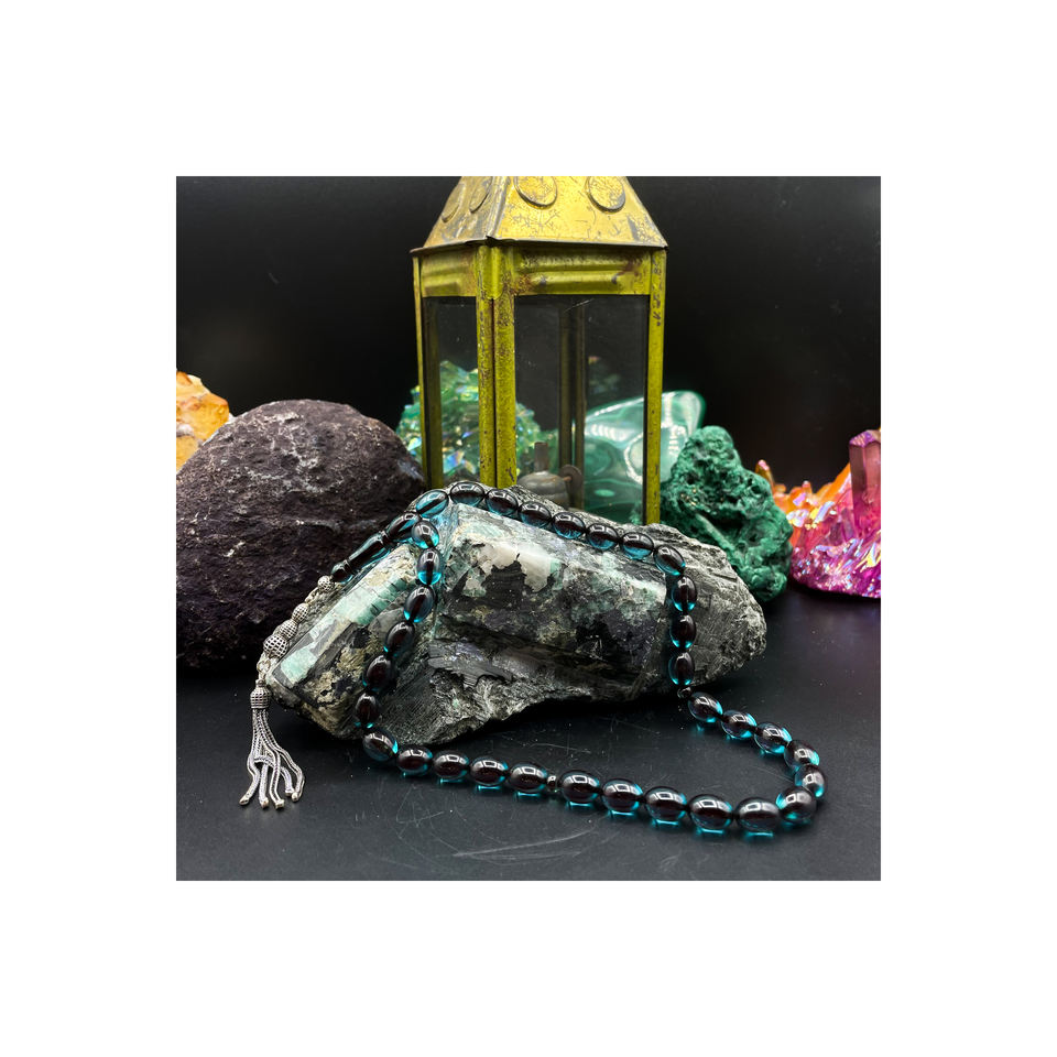 Perline di Preghiera in Vetro Blu Fatte a Mano, Taglio Ovale con Nappa in Argento